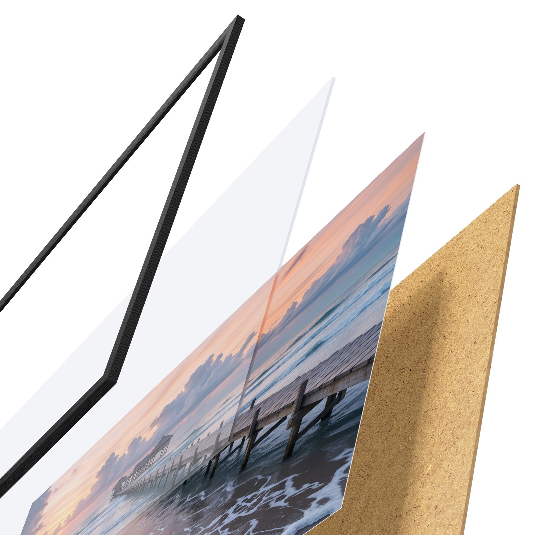 Das Poster besteht aus einem Rahmen, Plexiglas, einem gedruckten Bild und einer Rückwand aus Spanplatten. Dank der Halterungen auf der Rückseite kann das Poster sofort an die Wand gehängt werden.