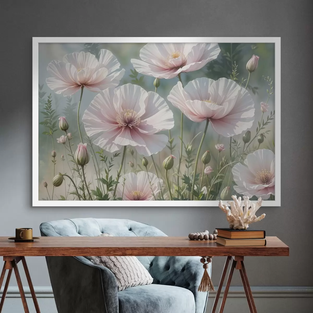Poster Ein Feld mit zarten, blassrosa Mohnblumen mit weichen, hauchzarten Blütenblättern vor einem verschwommenen grünen Hintergrund f41094