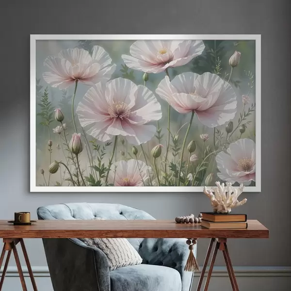Poster Ein Feld mit zarten, blassrosa Mohnblumen mit weichen, hauchzarten Blütenblättern vor einem verschwommenen grünen Hintergrund Nr f41094