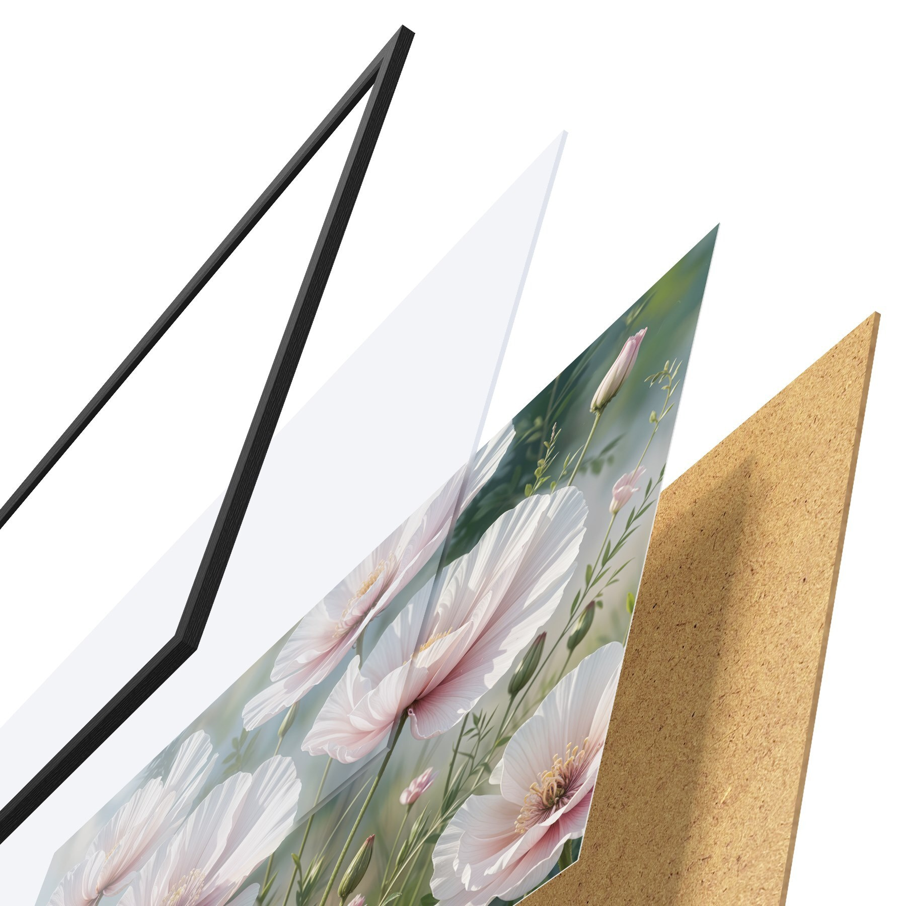 Das Poster besteht aus einem Rahmen, Plexiglas, einem gedruckten Bild und einer Rückwand aus Spanplatten. Dank der Halterungen auf der Rückseite kann das Poster sofort an die Wand gehängt werden.
