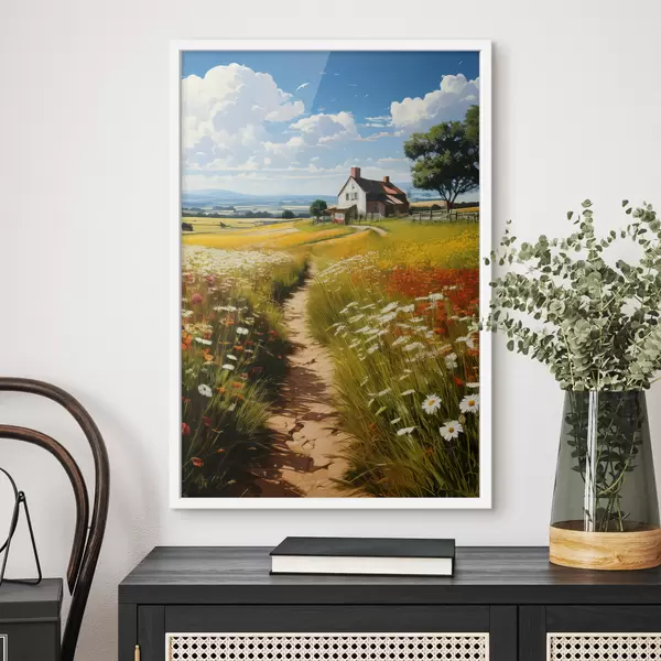 Poster ein Weg durch ein blühendes Feld und ein Haus Nr f41109