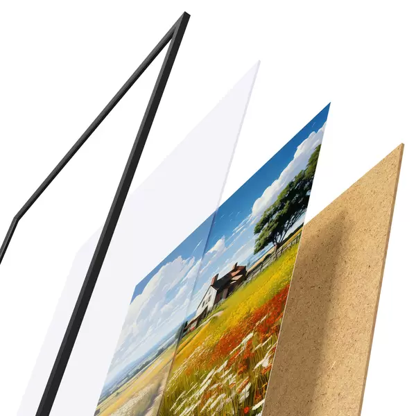 Das Poster besteht aus einem Rahmen, Plexiglas, einem gedruckten Bild und einer Rückwand aus Spanplatten. Dank der Halterungen auf der Rückseite kann das Poster sofort an die Wand gehängt werden.