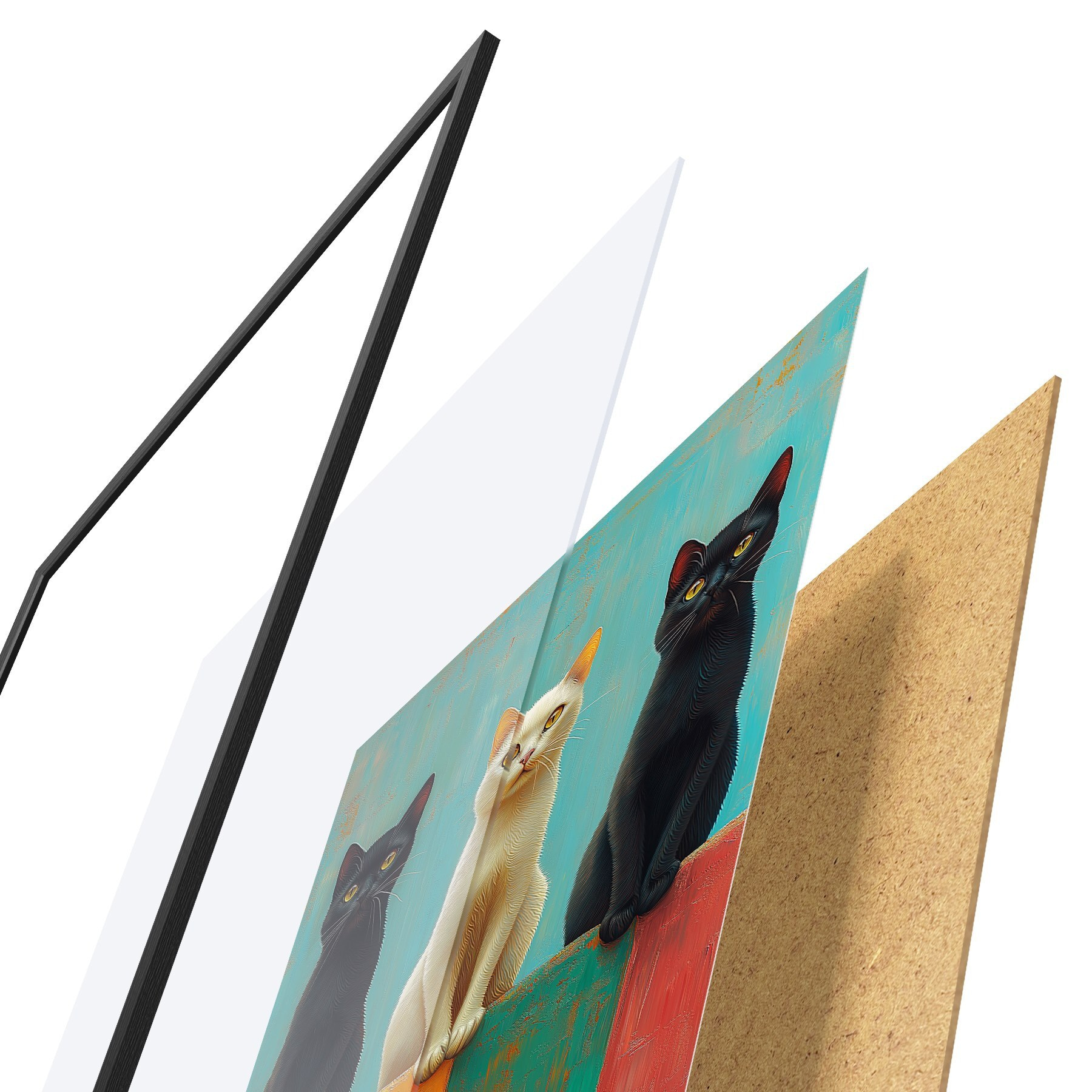 Das Poster besteht aus einem Rahmen, Plexiglas, einem gedruckten Bild und einer Rückwand aus Spanplatten. Dank der Halterungen auf der Rückseite kann das Poster sofort an die Wand gehängt werden.