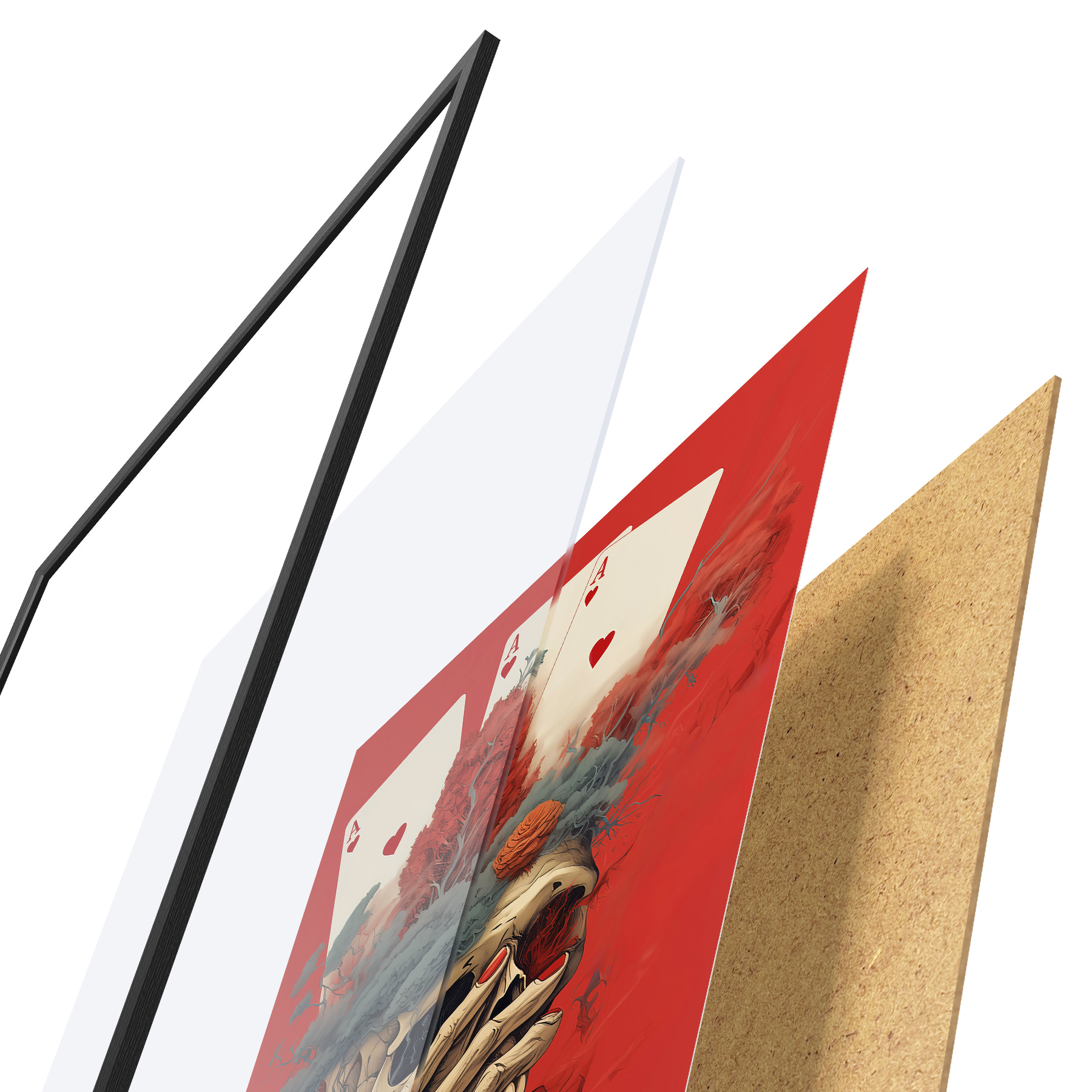 Das Poster besteht aus einem Rahmen, Plexiglas, einem gedruckten Bild und einer Rückwand aus Spanplatten. Dank der Halterungen auf der Rückseite kann das Poster sofort an die Wand gehängt werden.