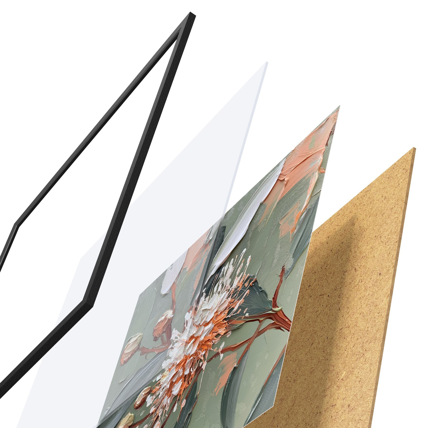 Das Poster besteht aus einem Rahmen, Plexiglas, einem gedruckten Bild und einer Rückwand aus Spanplatten. Dank der Halterungen auf der Rückseite kann das Poster sofort an die Wand gehängt werden.