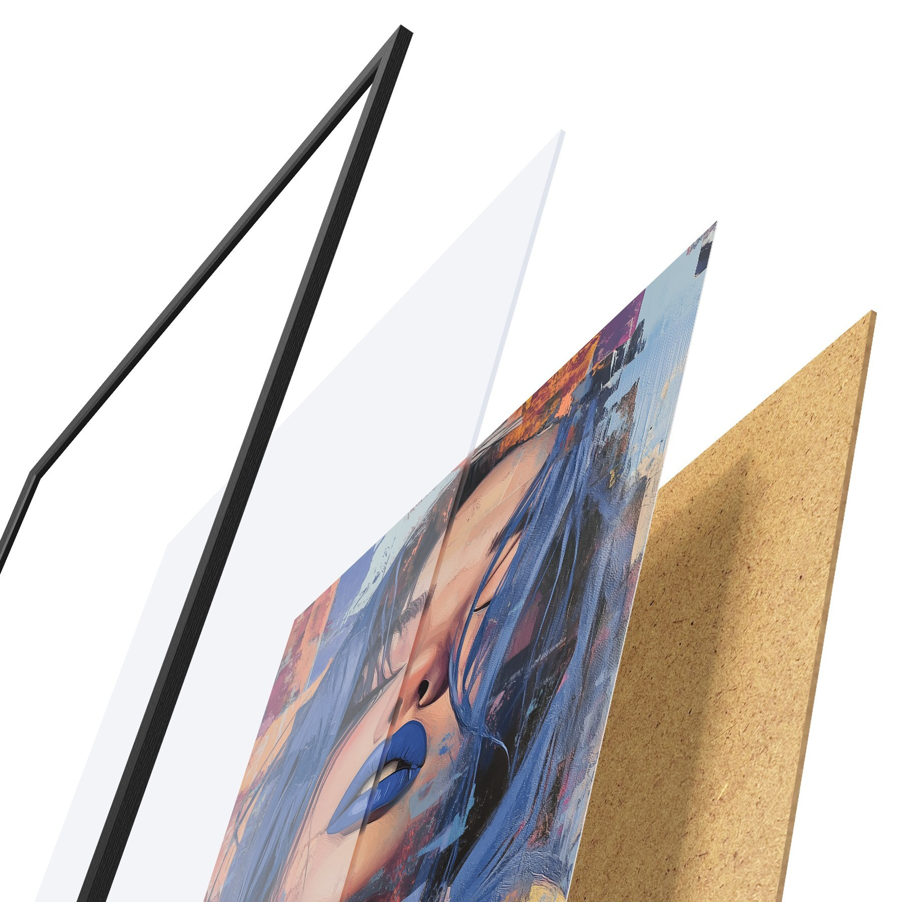 Das Poster besteht aus einem Rahmen, Plexiglas, einem gedruckten Bild und einer Rückwand aus Spanplatten. Dank der Halterungen auf der Rückseite kann das Poster sofort an die Wand gehängt werden.