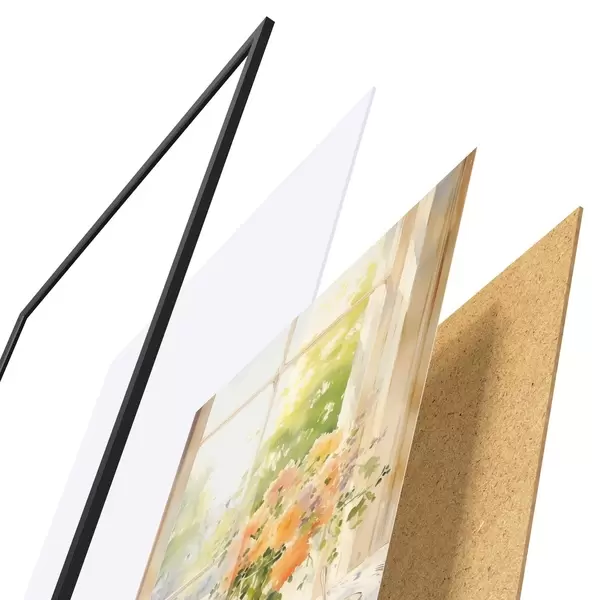 Das Poster besteht aus einem Rahmen, Plexiglas, einem gedruckten Bild und einer Rückwand aus Spanplatten. Dank der Halterungen auf der Rückseite kann das Poster sofort an die Wand gehängt werden.
