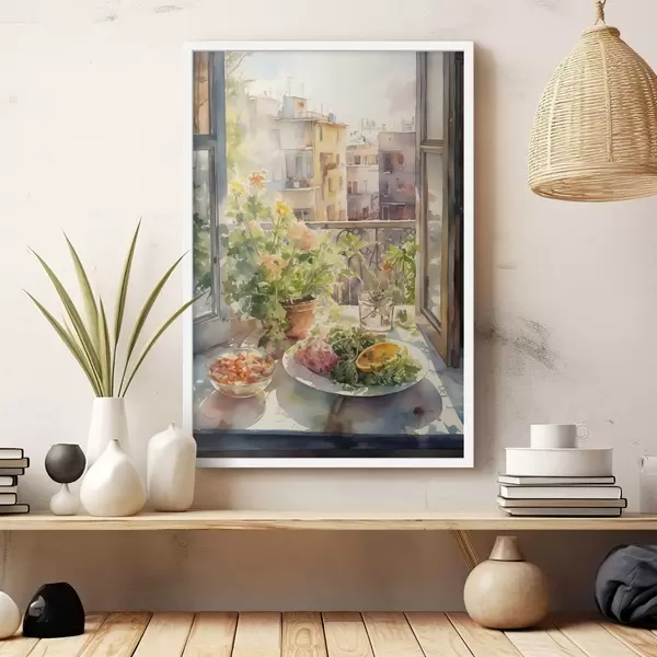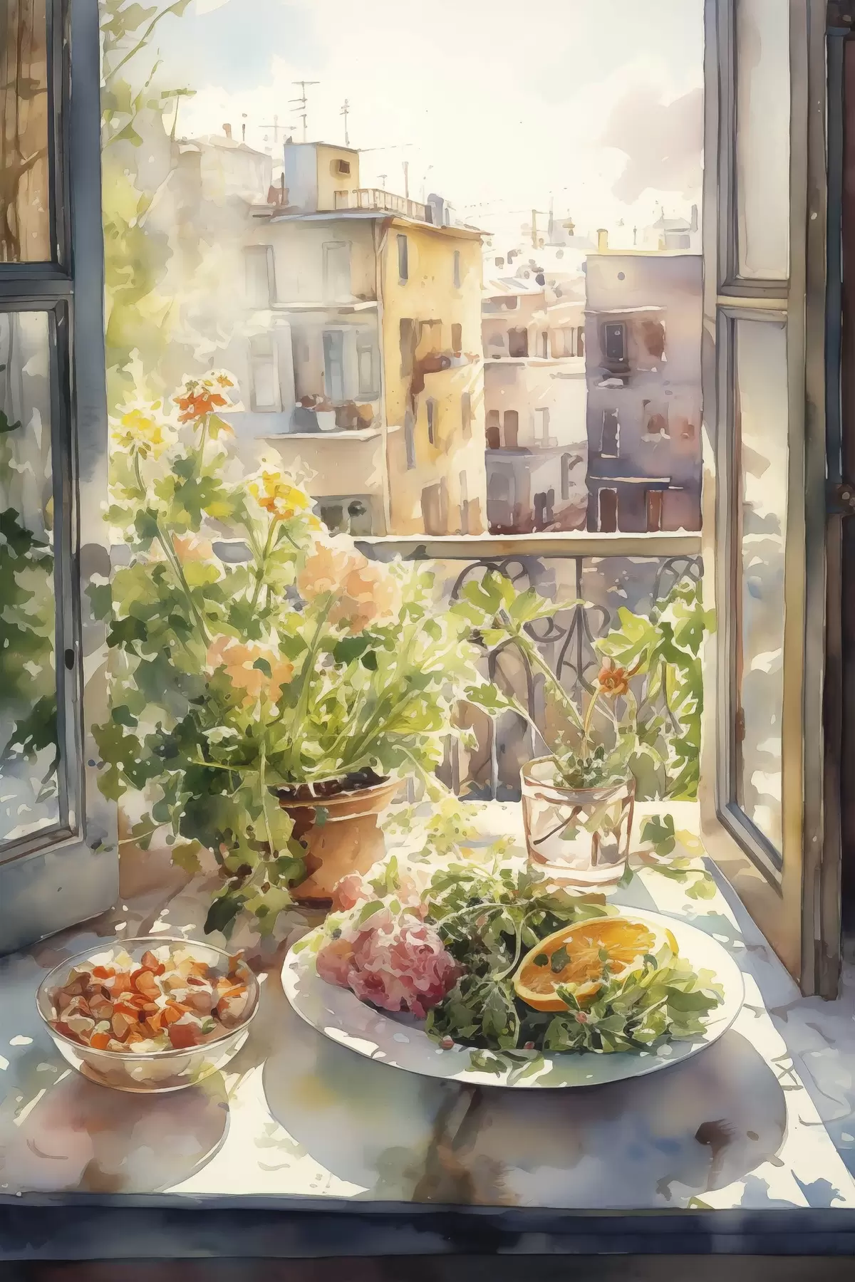 Poster Aquarell Abendessen, Stadtansicht, Blumen, Natur, grüner Salat Nr f41166
