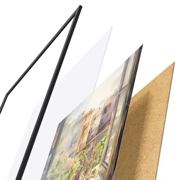 Das Poster besteht aus einem Rahmen, Plexiglas, einem gedruckten Bild und einer Rückwand aus Spanplatten. Dank der Halterungen auf der Rückseite kann das Poster sofort an die Wand gehängt werden.