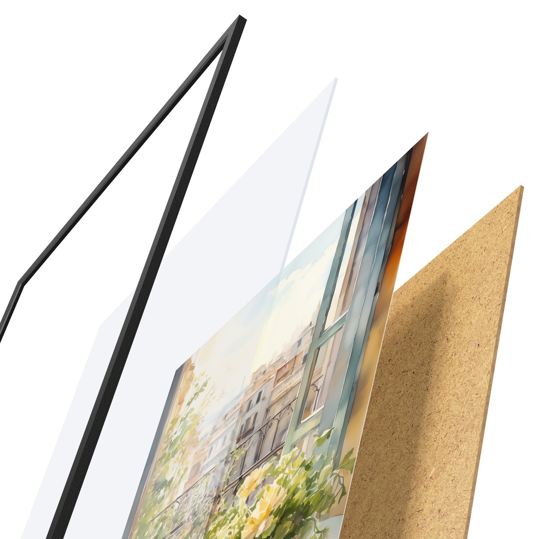 Das Poster besteht aus einem Rahmen, Plexiglas, einem gedruckten Bild und einer Rückwand aus Spanplatten. Dank der Halterungen auf der Rückseite kann das Poster sofort an die Wand gehängt werden.