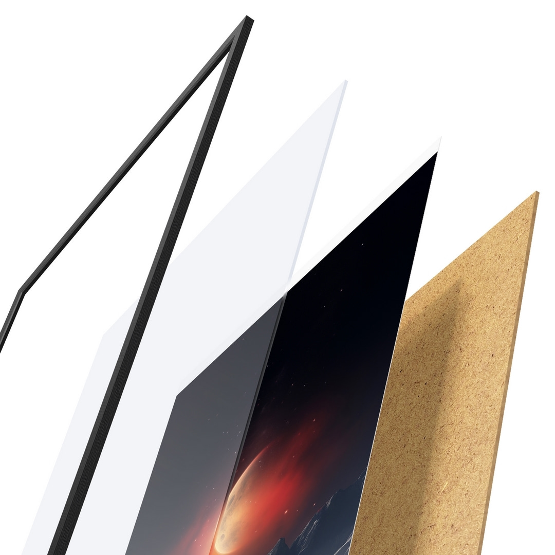 Das Poster besteht aus einem Rahmen, Plexiglas, einem gedruckten Bild und einer Rückwand aus Spanplatten. Dank der Halterungen auf der Rückseite kann das Poster sofort an die Wand gehängt werden.