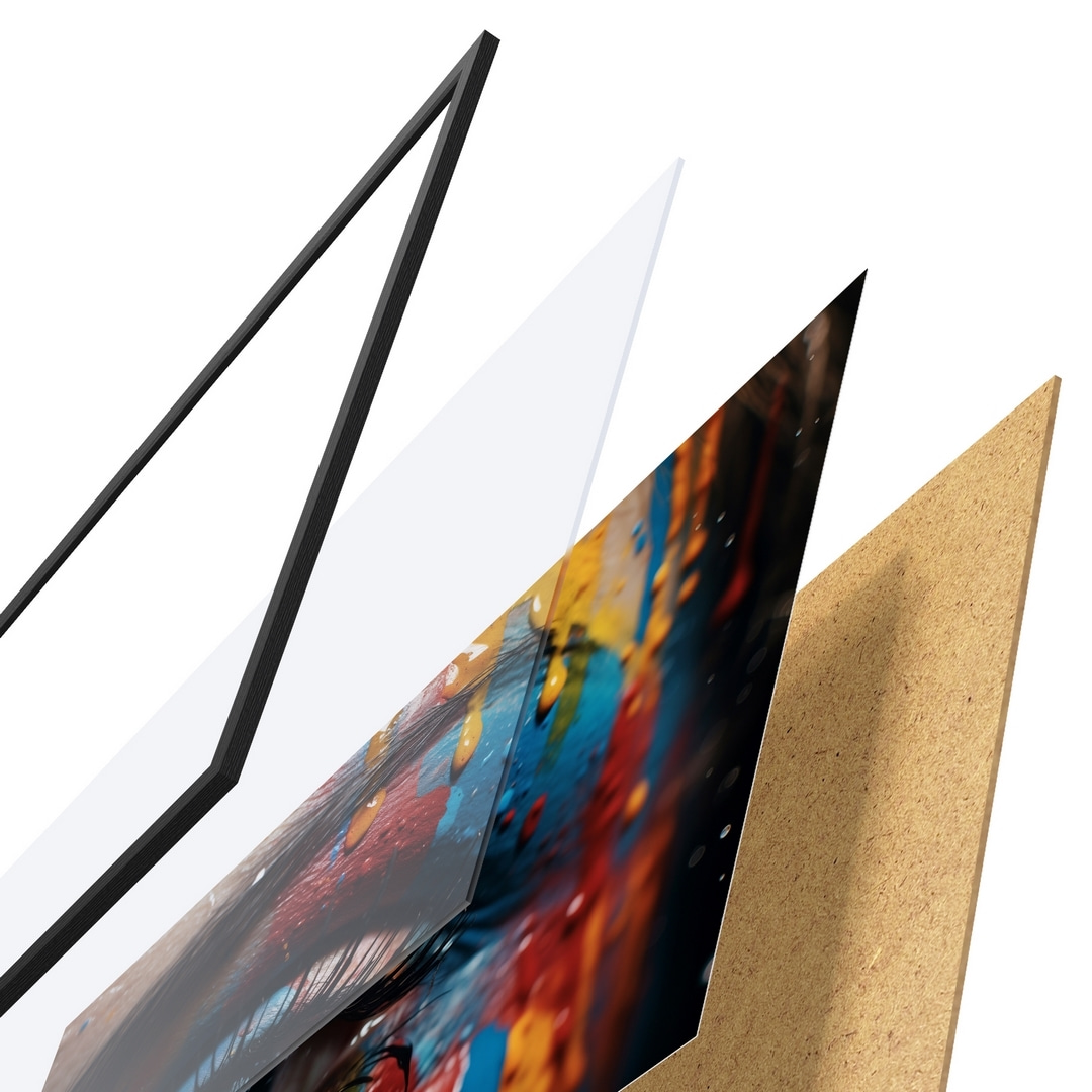 Das Poster besteht aus einem Rahmen, Plexiglas, einem gedruckten Bild und einer Rückwand aus Spanplatten. Dank der Halterungen auf der Rückseite kann das Poster sofort an die Wand gehängt werden.