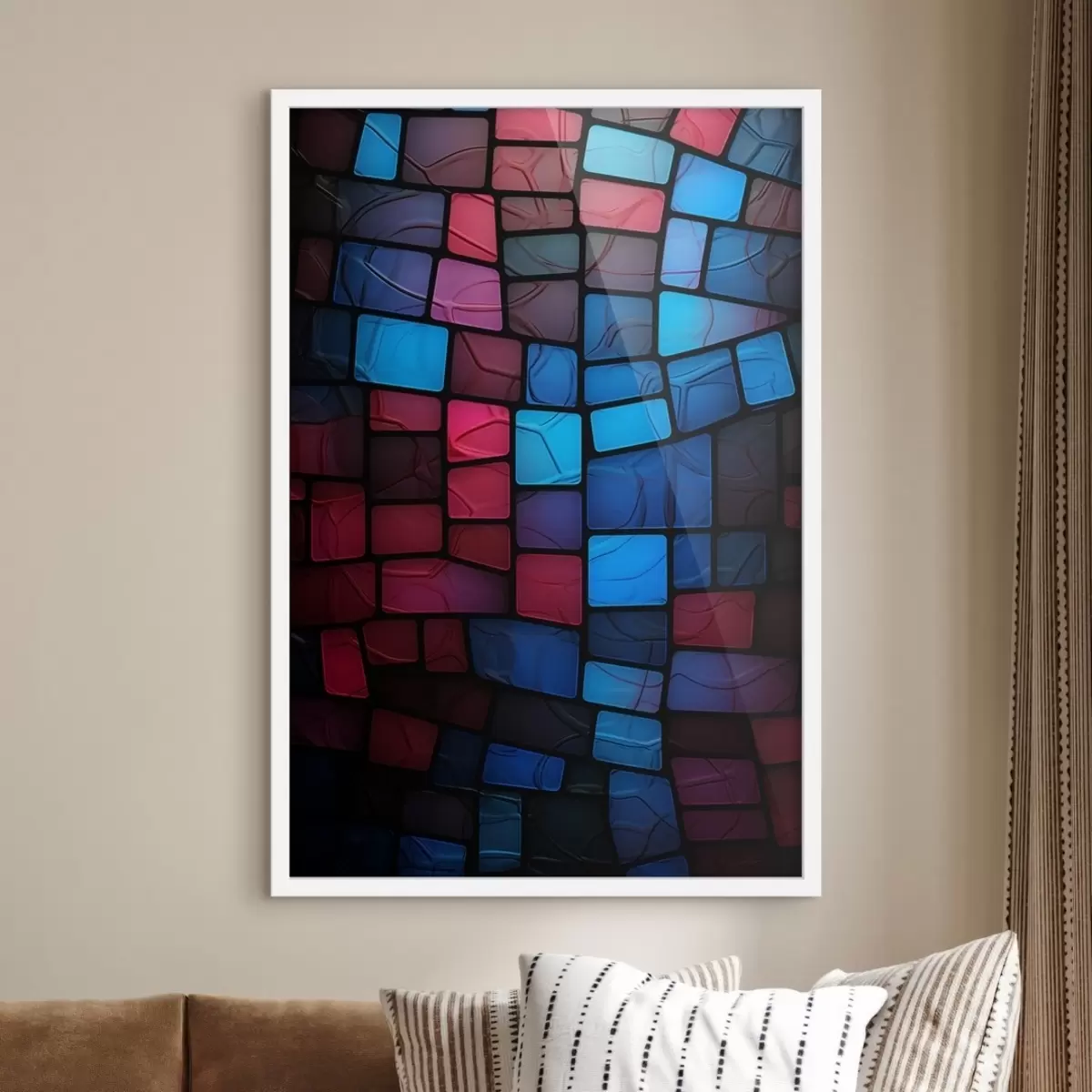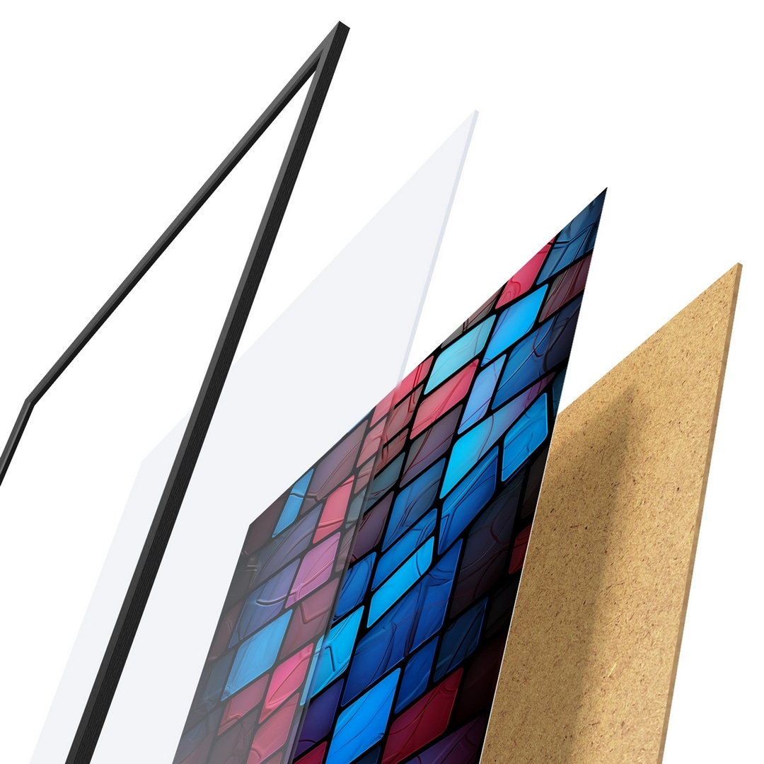 Das Poster besteht aus einem Rahmen, Plexiglas, einem gedruckten Bild und einer Rückwand aus Spanplatten. Dank der Halterungen auf der Rückseite kann das Poster sofort an die Wand gehängt werden.