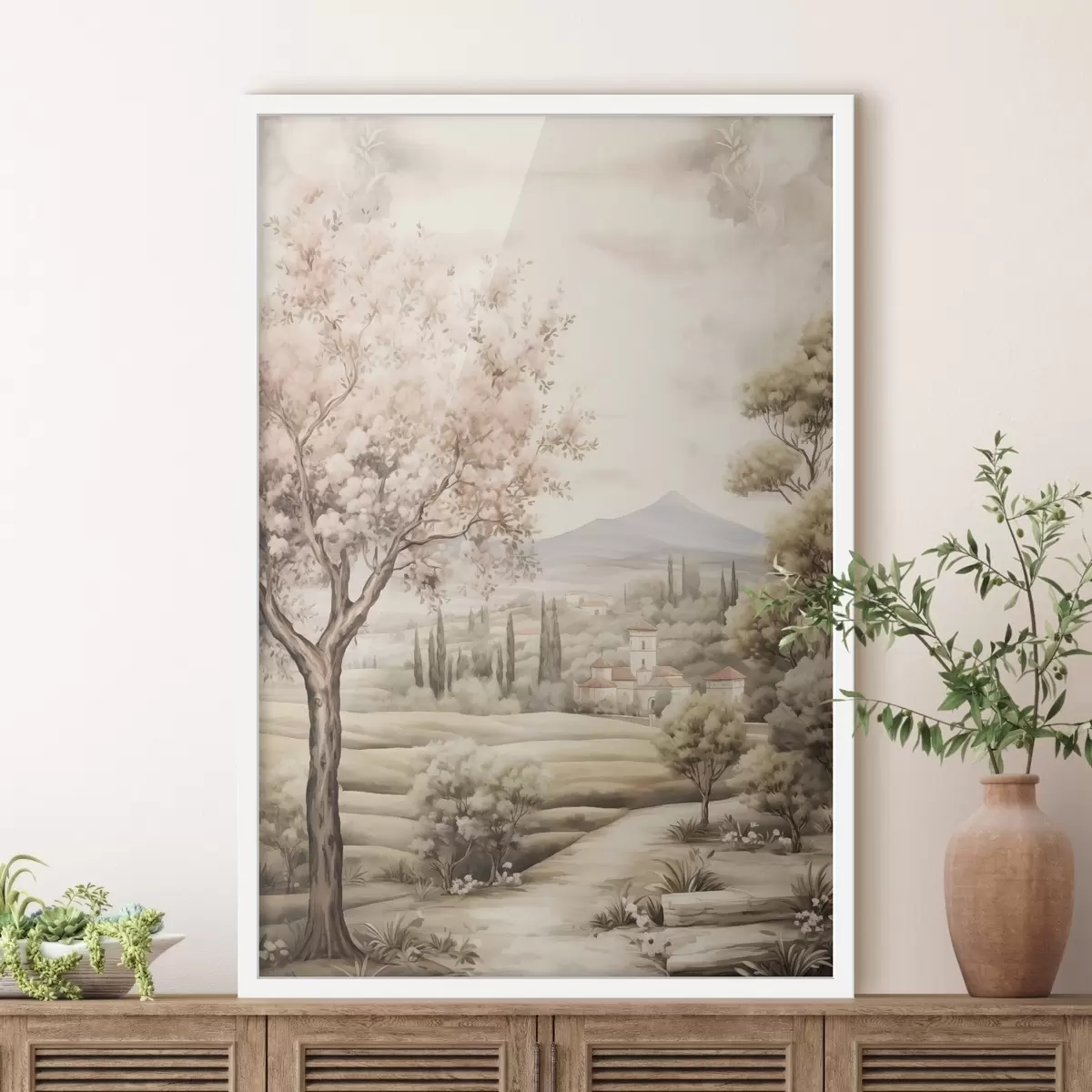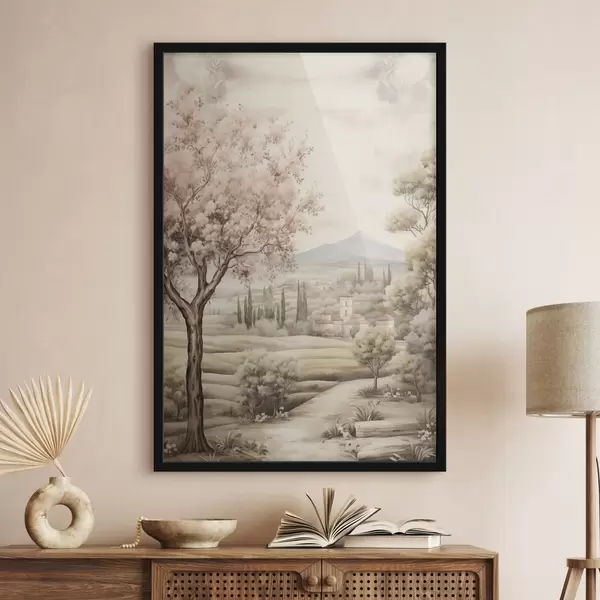 Poster Aquarell Hügel, blühender Kirschbaum, Schloss, rustikaler Stil Nr f41225