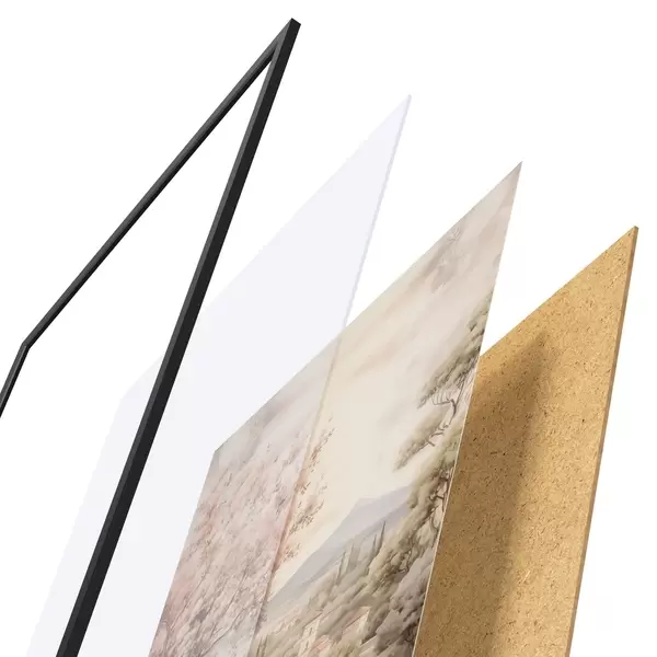 Das Poster besteht aus einem Rahmen, Plexiglas, einem gedruckten Bild und einer Rückwand aus Spanplatten. Dank der Halterungen auf der Rückseite kann das Poster sofort an die Wand gehängt werden.