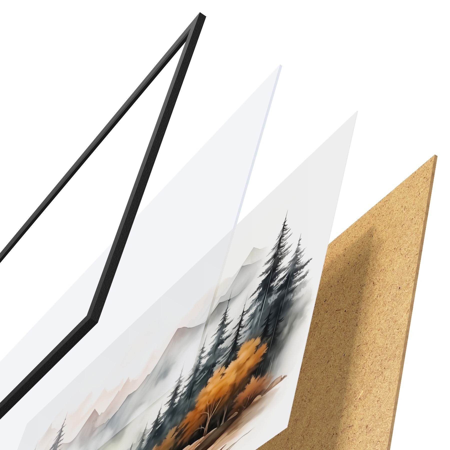Das Poster besteht aus einem Rahmen, Plexiglas, einem gedruckten Bild und einer Rückwand aus Spanplatten. Dank der Halterungen auf der Rückseite kann das Poster sofort an die Wand gehängt werden.