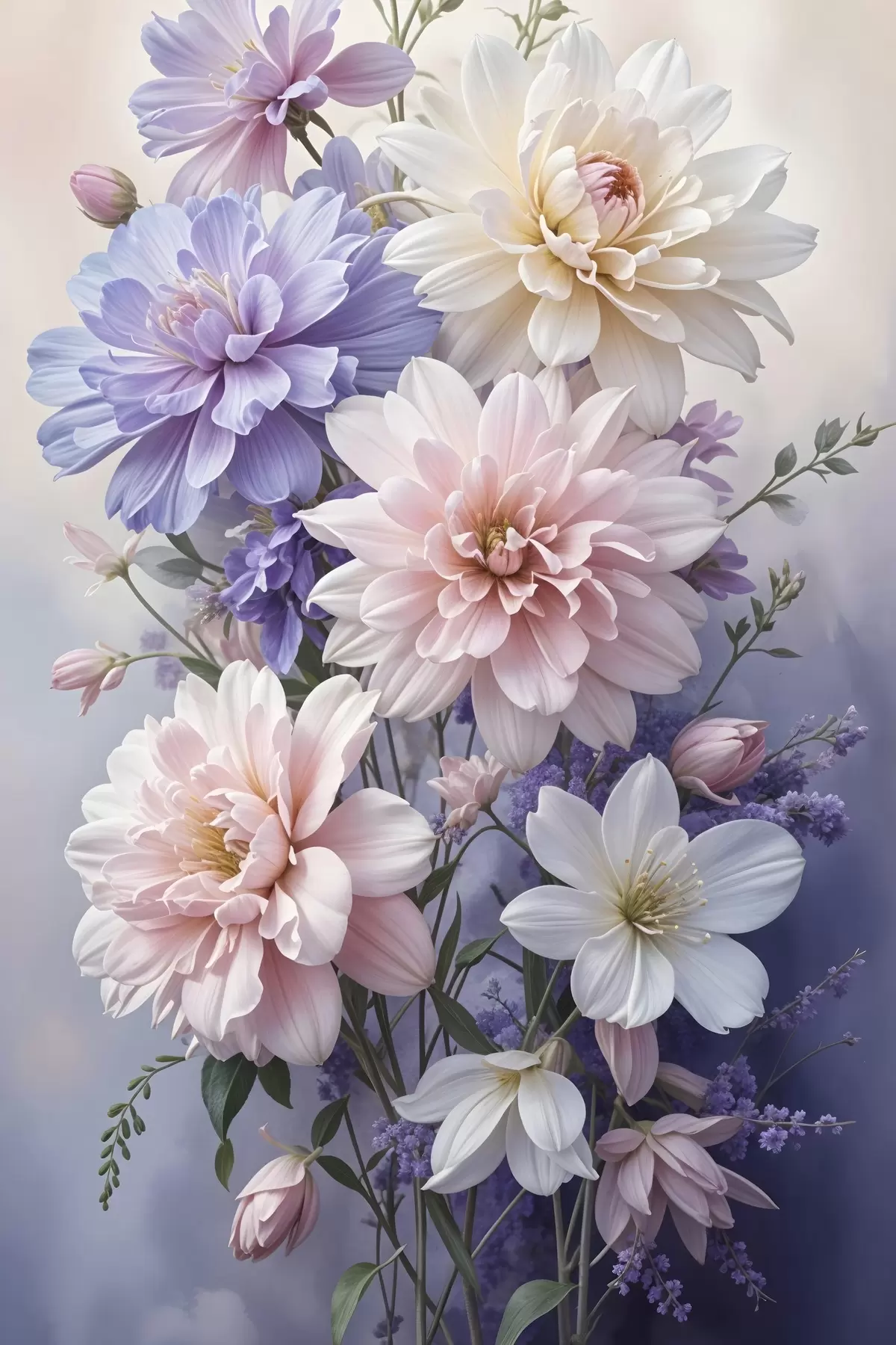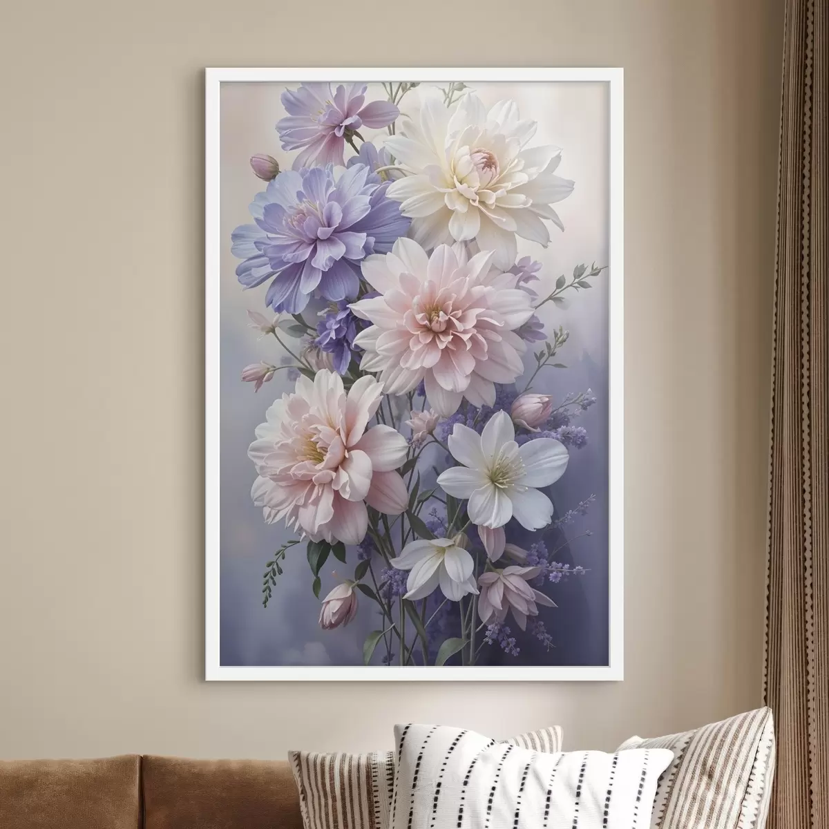 Poster Ein Strauß großer, leuchtender Dahlienblüten in rosa, lavendelfarbenen und weißen Tönen vor einem weichen, unscharfen Hintergrund Nr f41247