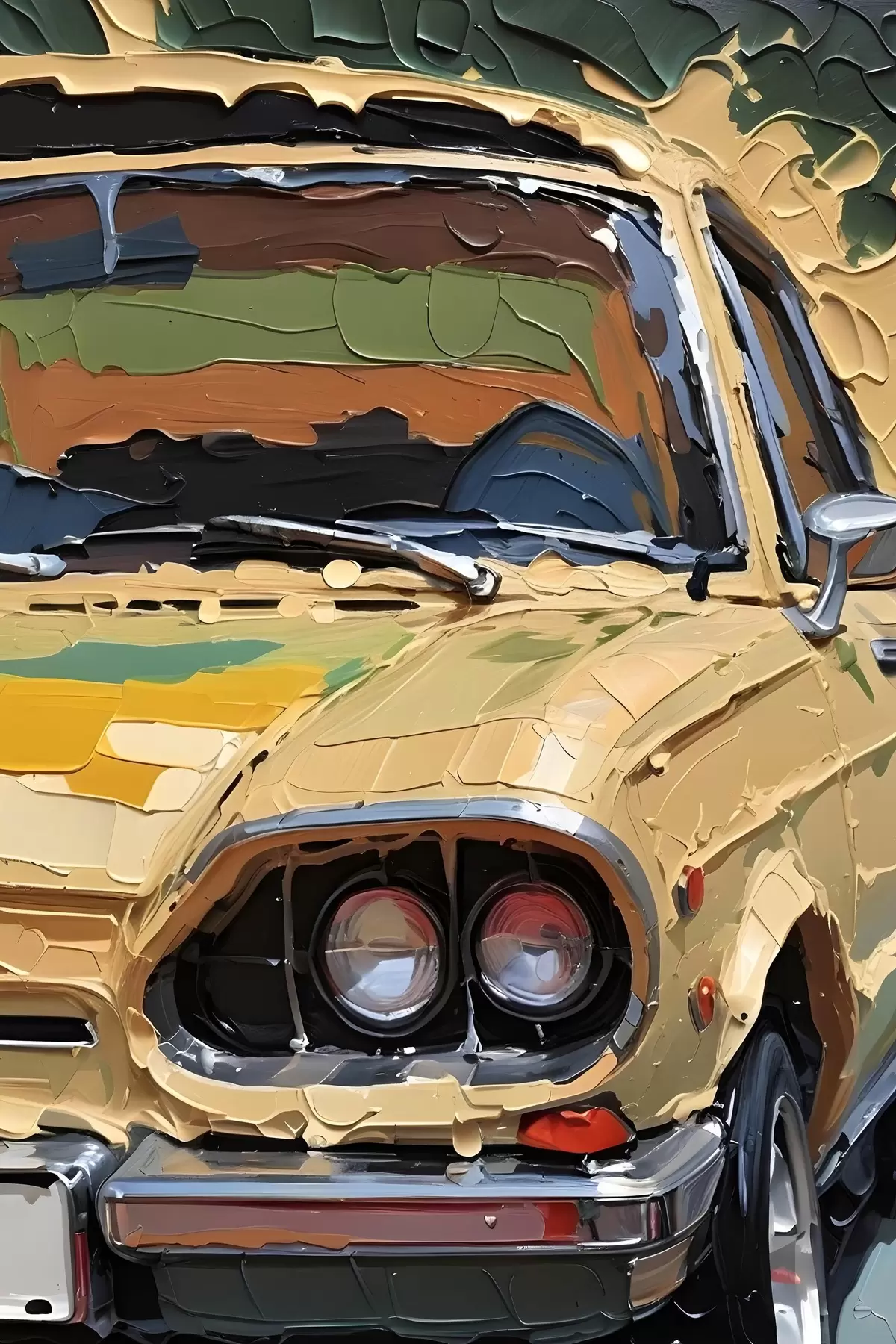 Poster Nachahmung eines pastosen Ölgemäldes eines gelben Autos vor einem bunten, abstrakten Hintergrund Nr f41261