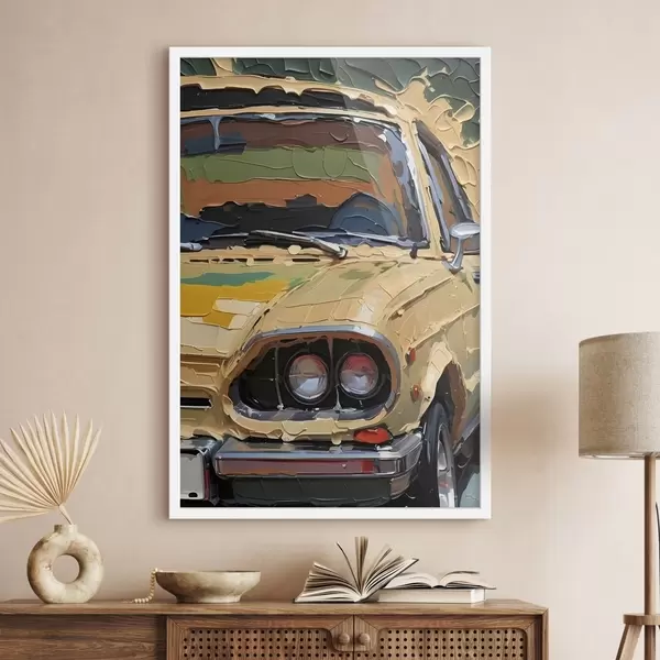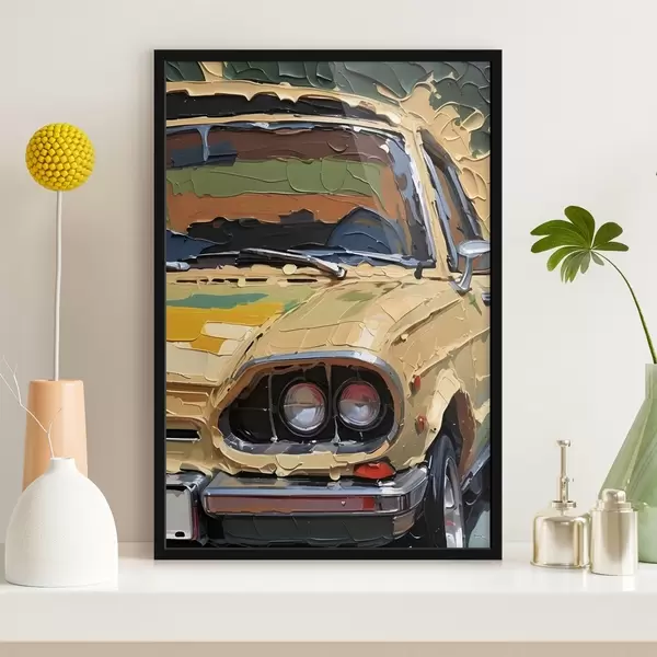 Poster Nachahmung eines pastosen Ölgemäldes eines gelben Autos vor einem bunten, abstrakten Hintergrund f41261