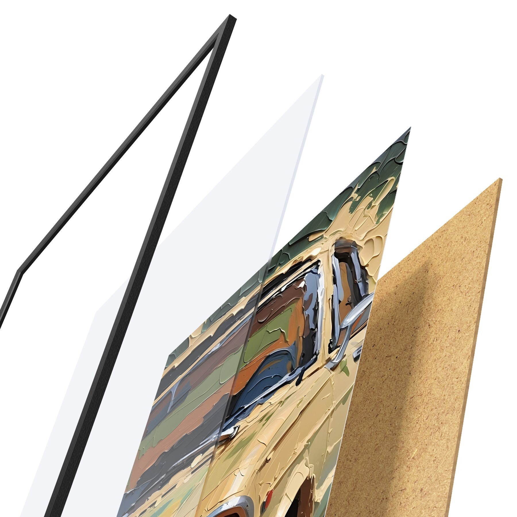 Das Poster besteht aus einem Rahmen, Plexiglas, einem gedruckten Bild und einer Rückwand aus Spanplatten. Dank der Halterungen auf der Rückseite kann das Poster sofort an die Wand gehängt werden.