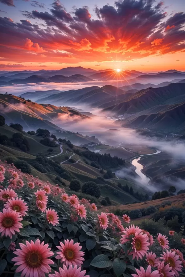 Poster Eine atemberaubende Landschaft mit einem farbenprächtigen Sonnenuntergang über einer Bergregion mit rosa Blütentrauben Nr f41263