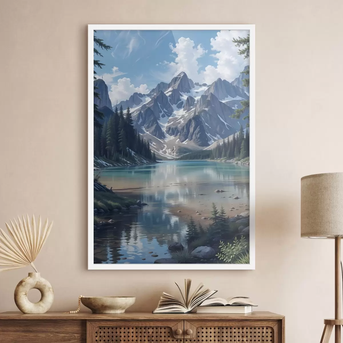 Poster Ein ruhiger Alpensee, umgeben von majestätischen schneebedeckten Bergen, mit einem dichten Wald und einem bewölkten Himmel Nr f41264