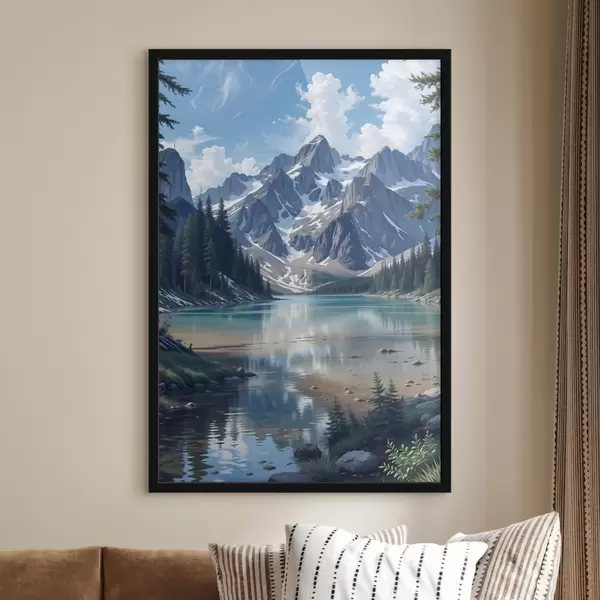 Poster Ein ruhiger Alpensee, umgeben von majestätischen schneebedeckten Bergen, mit einem dichten Wald und einem bewölkten Himmel f41264
