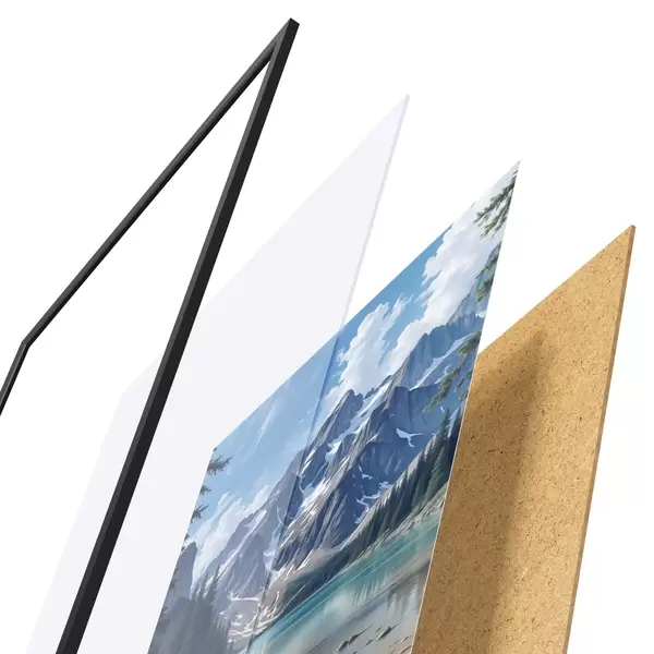 Das Poster besteht aus einem Rahmen, Plexiglas, einem gedruckten Bild und einer Rückwand aus Spanplatten. Dank der Halterungen auf der Rückseite kann das Poster sofort an die Wand gehängt werden.