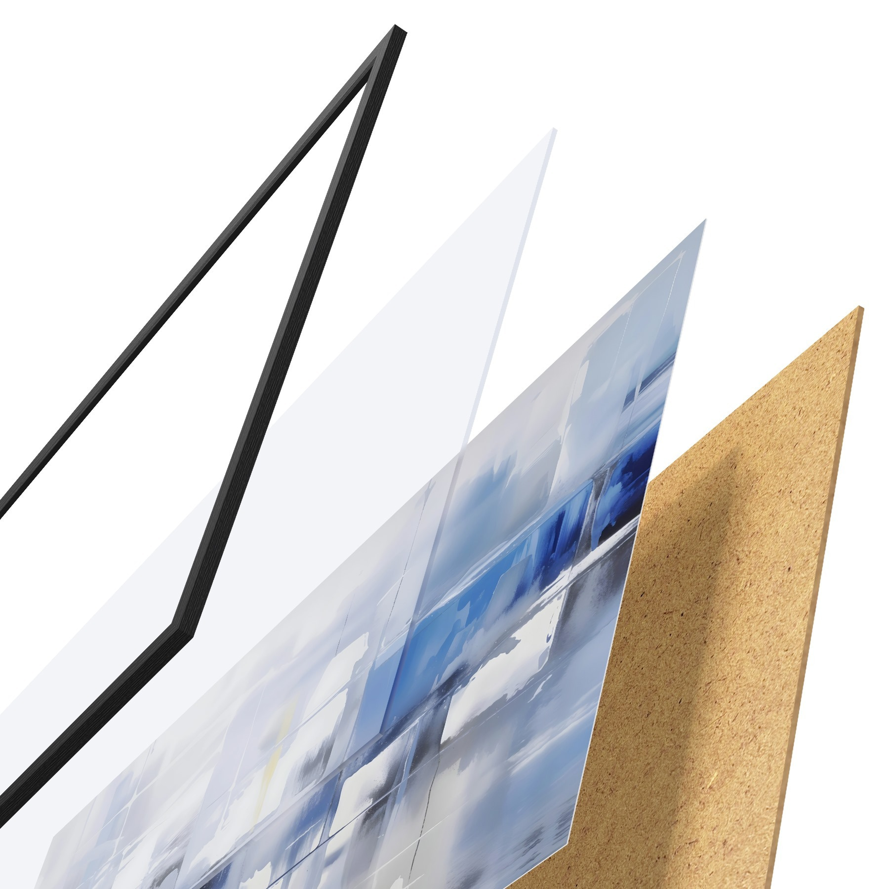 Das Poster besteht aus einem Rahmen, Plexiglas, einem gedruckten Bild und einer Rückwand aus Spanplatten. Dank der Halterungen auf der Rückseite kann das Poster sofort an die Wand gehängt werden.