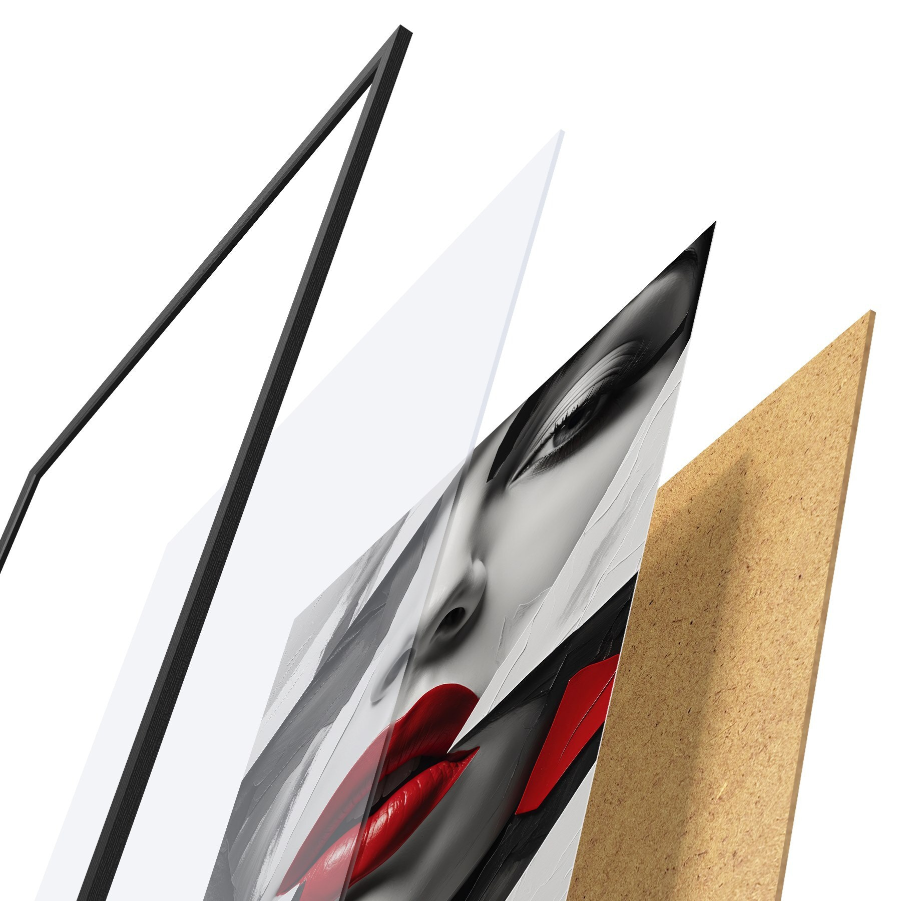Das Poster besteht aus einem Rahmen, Plexiglas, einem gedruckten Bild und einer Rückwand aus Spanplatten. Dank der Halterungen auf der Rückseite kann das Poster sofort an die Wand gehängt werden.
