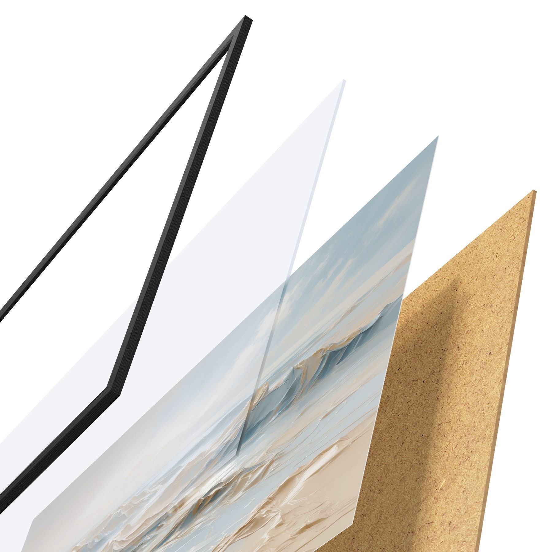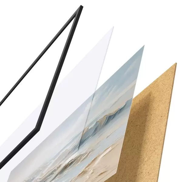 Das Poster besteht aus einem Rahmen, Plexiglas, einem gedruckten Bild und einer Rückwand aus Spanplatten. Dank der Halterungen auf der Rückseite kann das Poster sofort an die Wand gehängt werden.