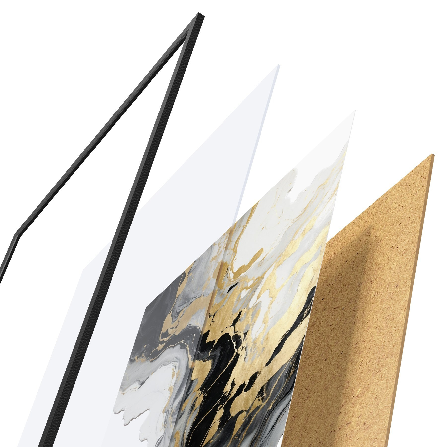 Das Poster besteht aus einem Rahmen, Plexiglas, einem gedruckten Bild und einer Rückwand aus Spanplatten. Dank der Halterungen auf der Rückseite kann das Poster sofort an die Wand gehängt werden.