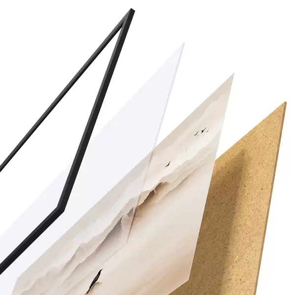 Das Poster besteht aus einem Rahmen, Plexiglas, einem gedruckten Bild und einer Rückwand aus Spanplatten. Dank der Halterungen auf der Rückseite kann das Poster sofort an die Wand gehängt werden.
