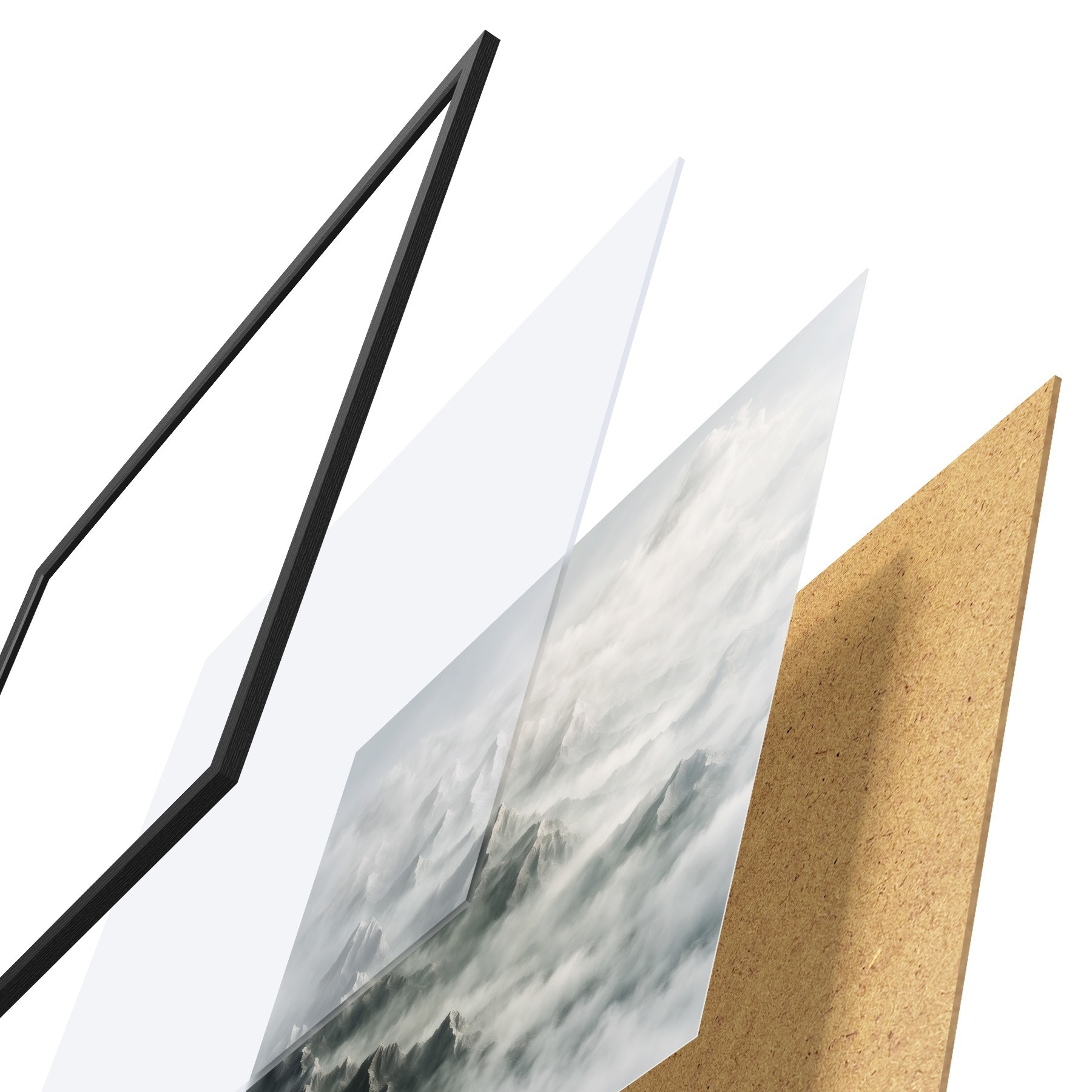 Das Poster besteht aus einem Rahmen, Plexiglas, einem gedruckten Bild und einer Rückwand aus Spanplatten. Dank der Halterungen auf der Rückseite kann das Poster sofort an die Wand gehängt werden.