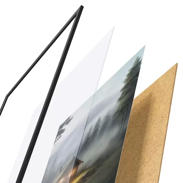 Das Poster besteht aus einem Rahmen, Plexiglas, einem gedruckten Bild und einer Rückwand aus Spanplatten. Dank der Halterungen auf der Rückseite kann das Poster sofort an die Wand gehängt werden.