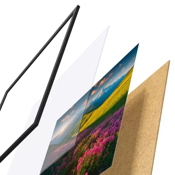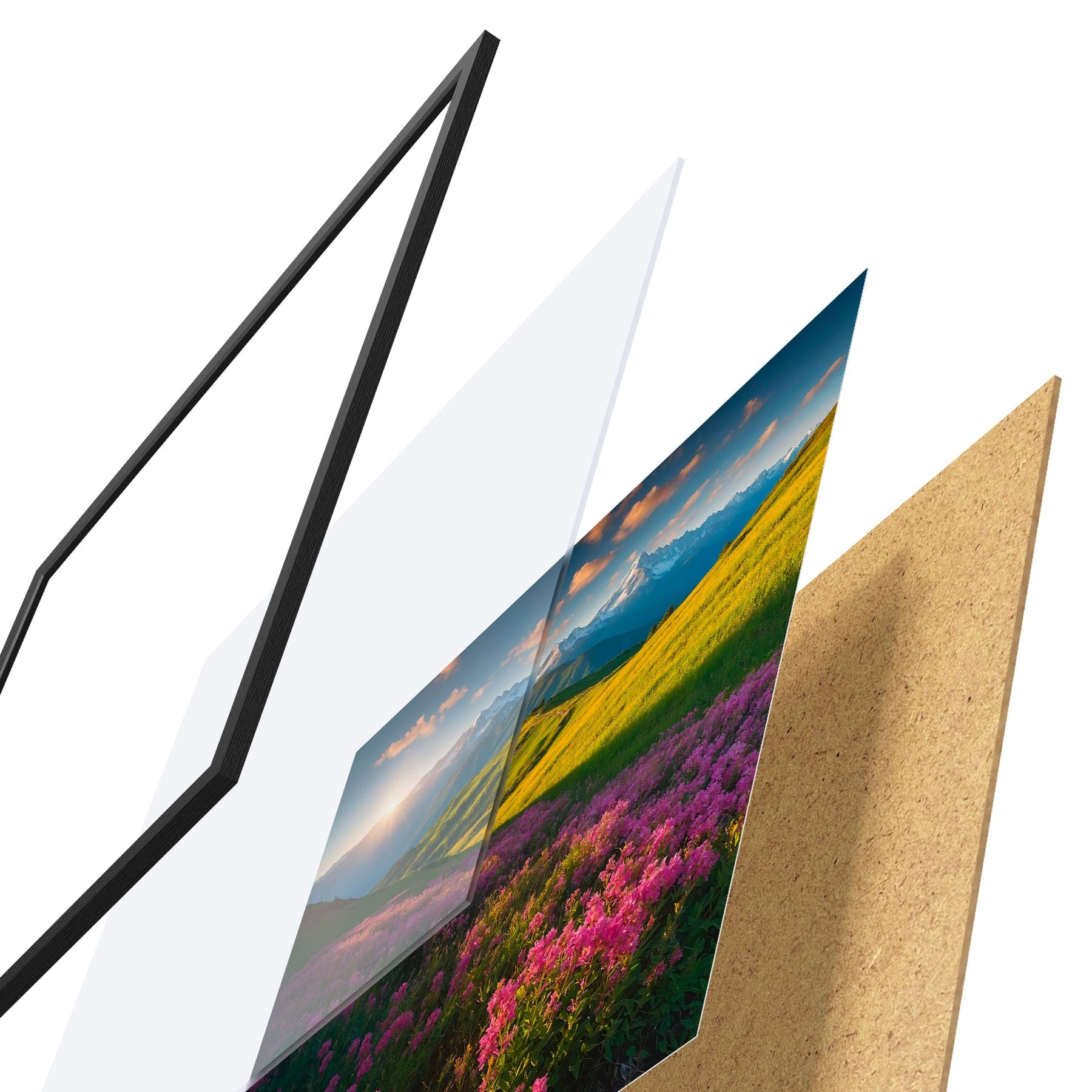 Das Poster besteht aus einem Rahmen, Plexiglas, einem gedruckten Bild und einer Rückwand aus Spanplatten. Dank der Halterungen auf der Rückseite kann das Poster sofort an die Wand gehängt werden.