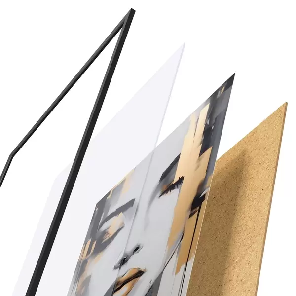 Das Poster besteht aus einem Rahmen, Plexiglas, einem gedruckten Bild und einer Rückwand aus Spanplatten. Dank der Halterungen auf der Rückseite kann das Poster sofort an die Wand gehängt werden.