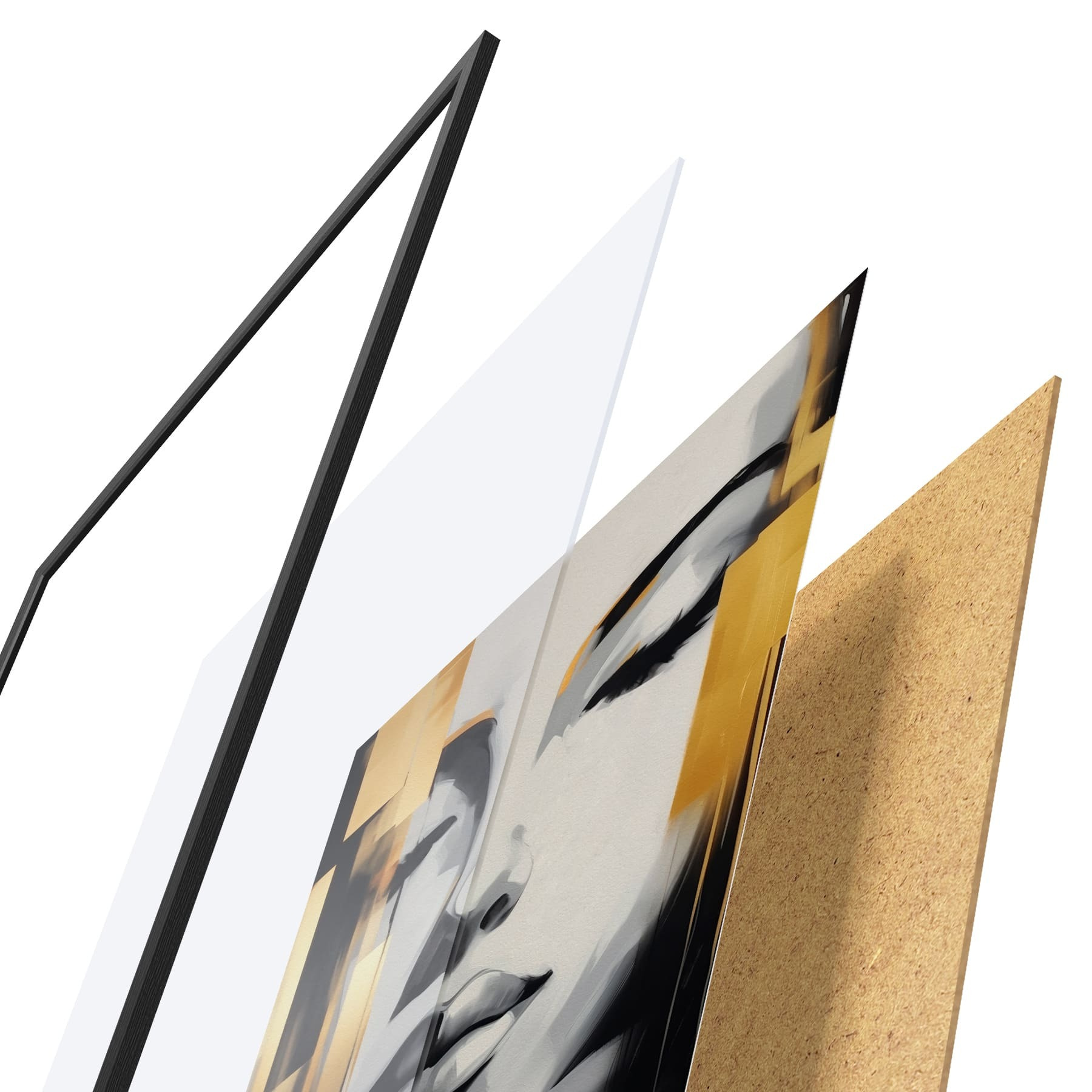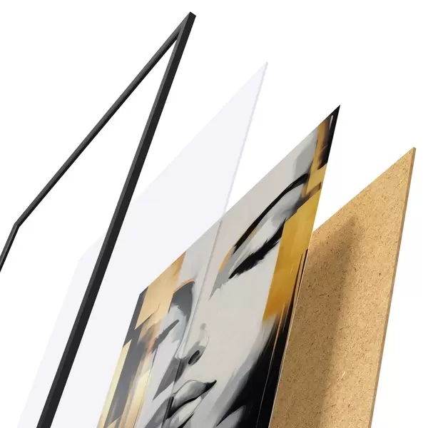 Das Poster besteht aus einem Rahmen, Plexiglas, einem gedruckten Bild und einer Rückwand aus Spanplatten. Dank der Halterungen auf der Rückseite kann das Poster sofort an die Wand gehängt werden.