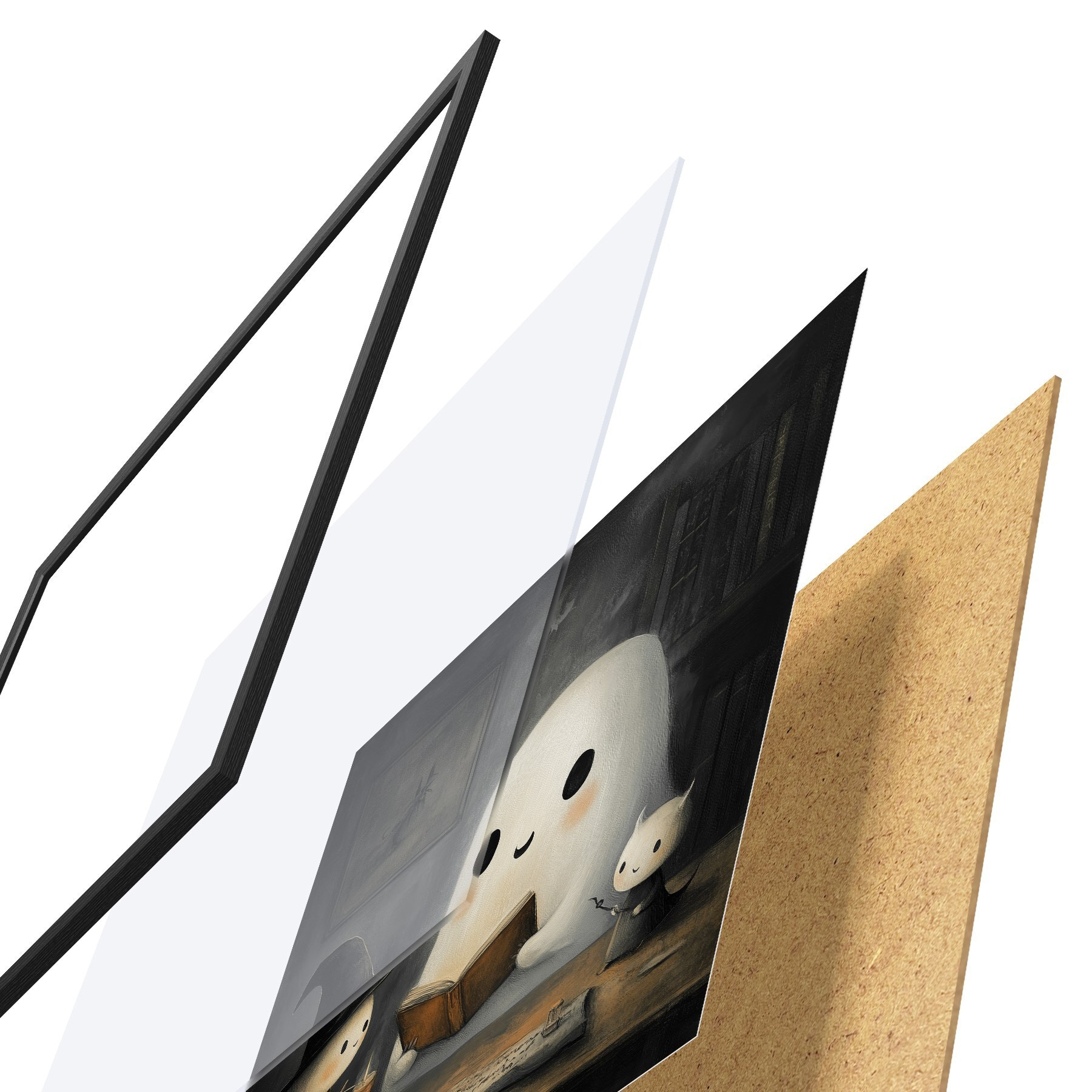 Das Poster besteht aus einem Rahmen, Plexiglas, einem gedruckten Bild und einer Rückwand aus Spanplatten. Dank der Halterungen auf der Rückseite kann das Poster sofort an die Wand gehängt werden.
