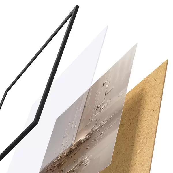 Das Poster besteht aus einem Rahmen, Plexiglas, einem gedruckten Bild und einer Rückwand aus Spanplatten. Dank der Halterungen auf der Rückseite kann das Poster sofort an die Wand gehängt werden.