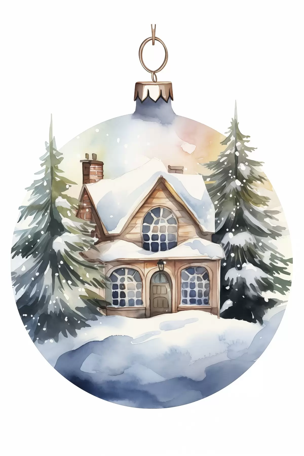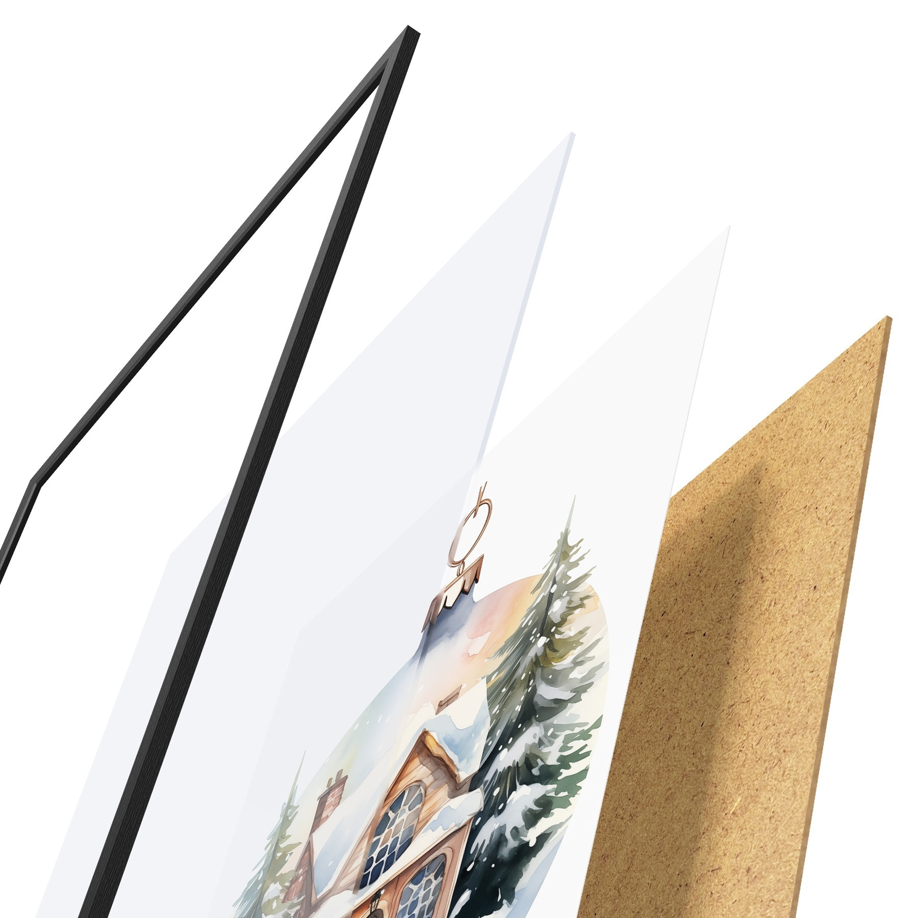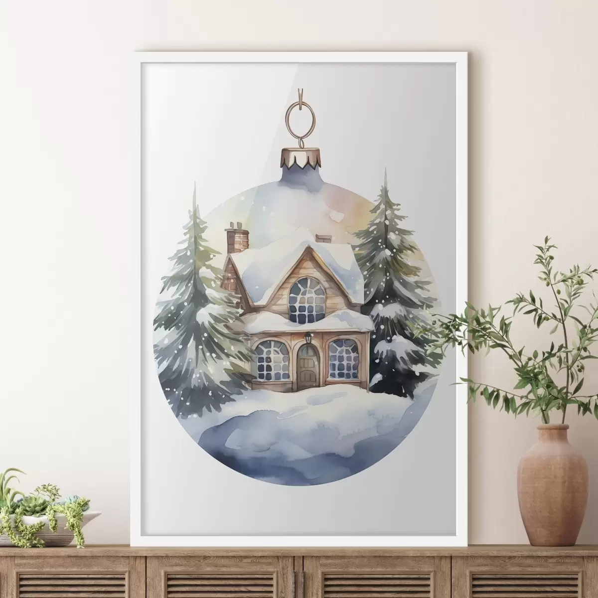Poster Weihnachtsdekoration Kugel mit Aquarell Haus im Schnee, Tannenbäume Nr f41363