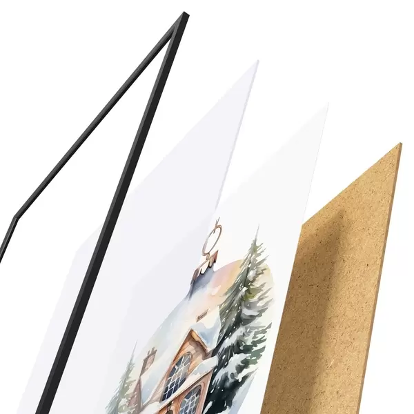 Das Poster besteht aus einem Rahmen, Plexiglas, einem gedruckten Bild und einer Rückwand aus Spanplatten. Dank der Halterungen auf der Rückseite kann das Poster sofort an die Wand gehängt werden.