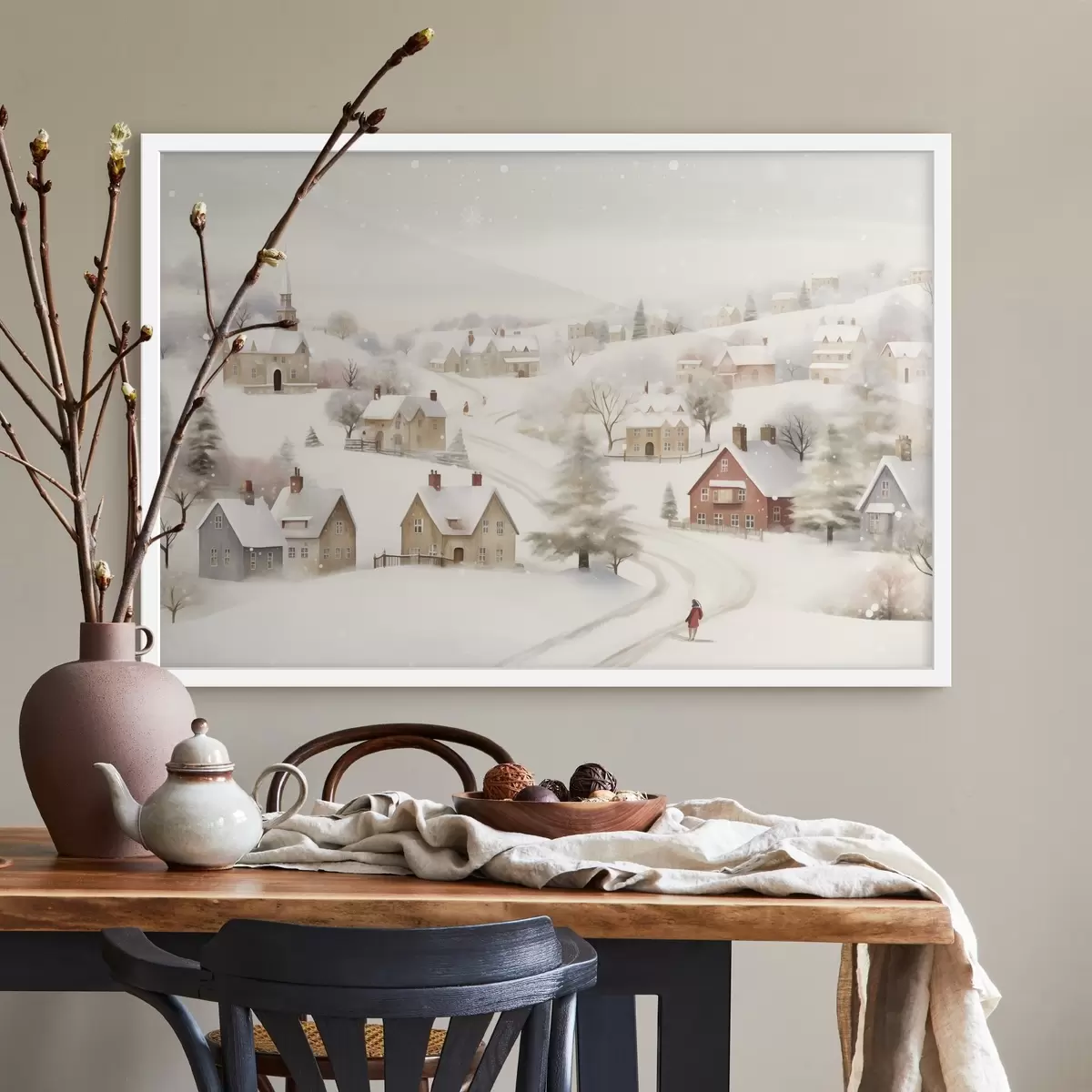 Poster Winterdorf, Aquarell, Schneeflocken, weiche Farben, Bäume, Landschaft Nr f41381