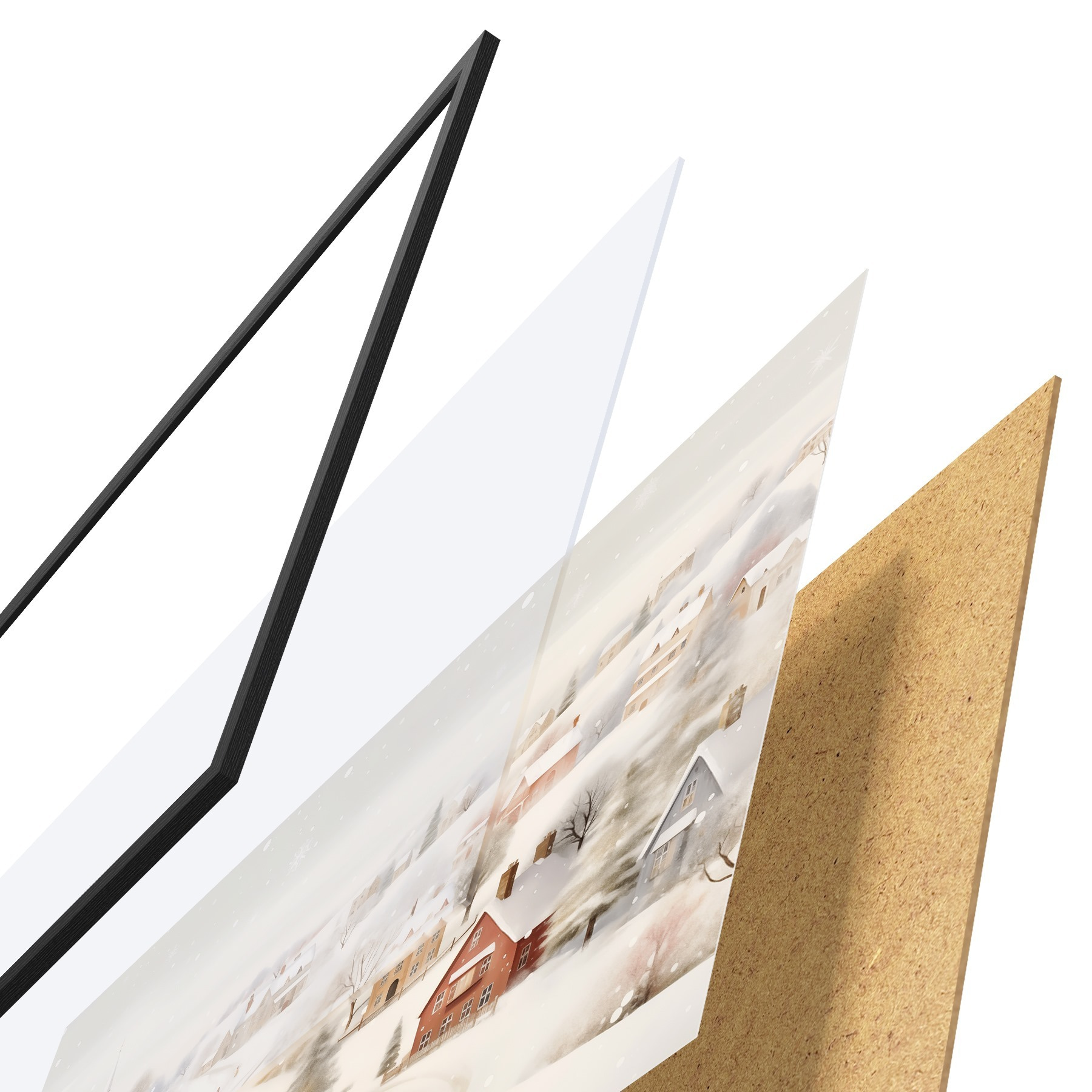 Das Poster besteht aus einem Rahmen, Plexiglas, einem gedruckten Bild und einer Rückwand aus Spanplatten. Dank der Halterungen auf der Rückseite kann das Poster sofort an die Wand gehängt werden.