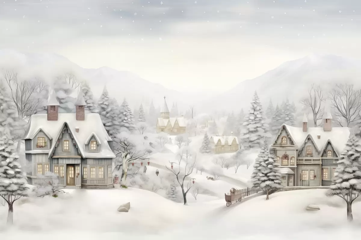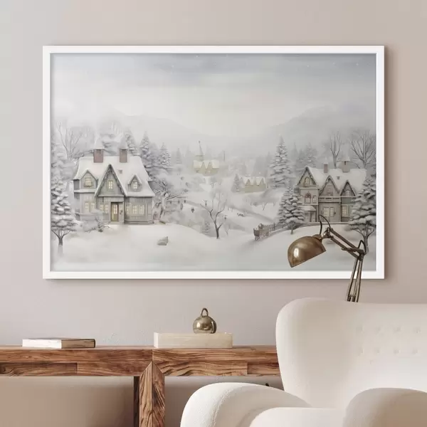 Poster Schöne Winterlandschaft mit Dorf, Kiefern, Häuser, Berge f41384