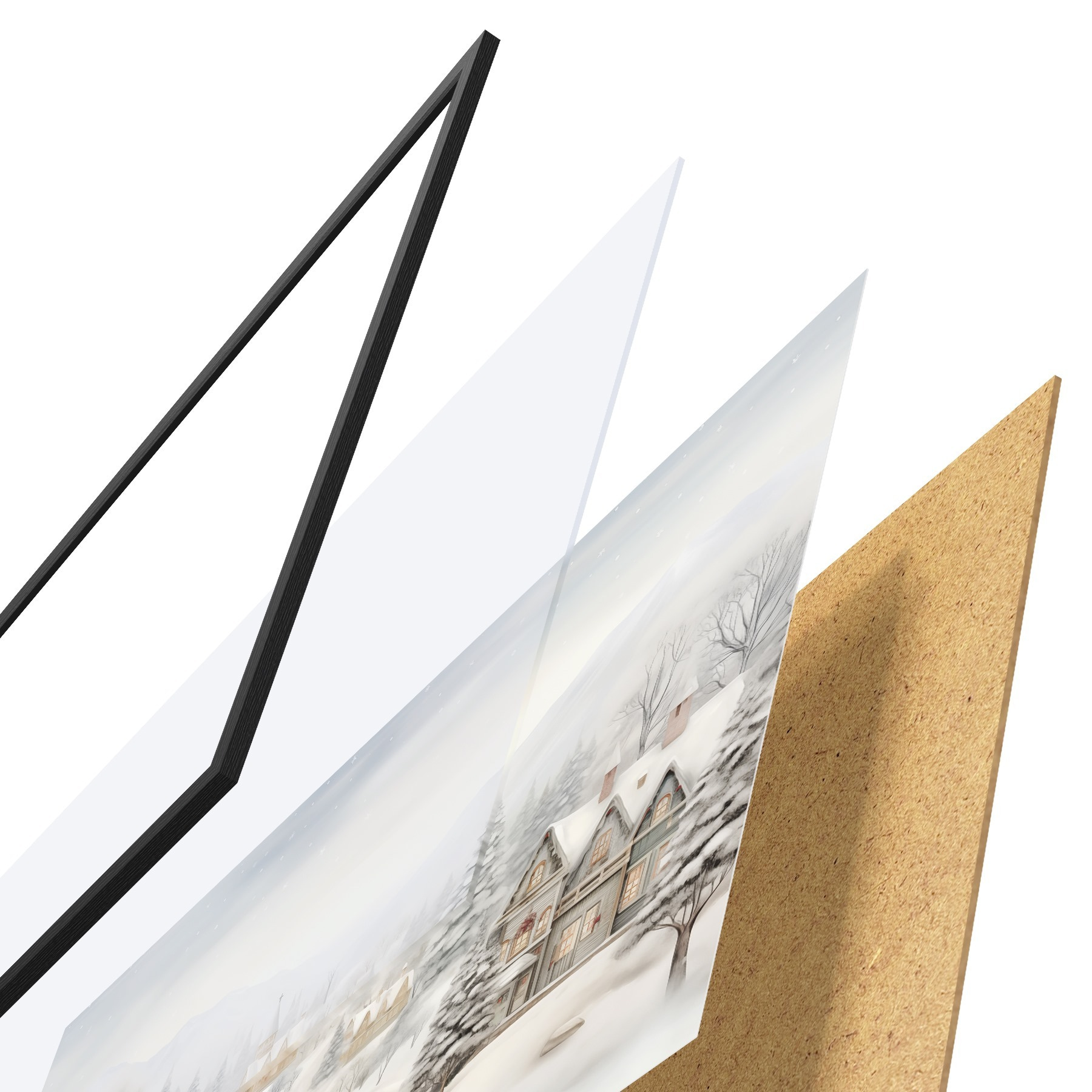 Das Poster besteht aus einem Rahmen, Plexiglas, einem gedruckten Bild und einer Rückwand aus Spanplatten. Dank der Halterungen auf der Rückseite kann das Poster sofort an die Wand gehängt werden.
