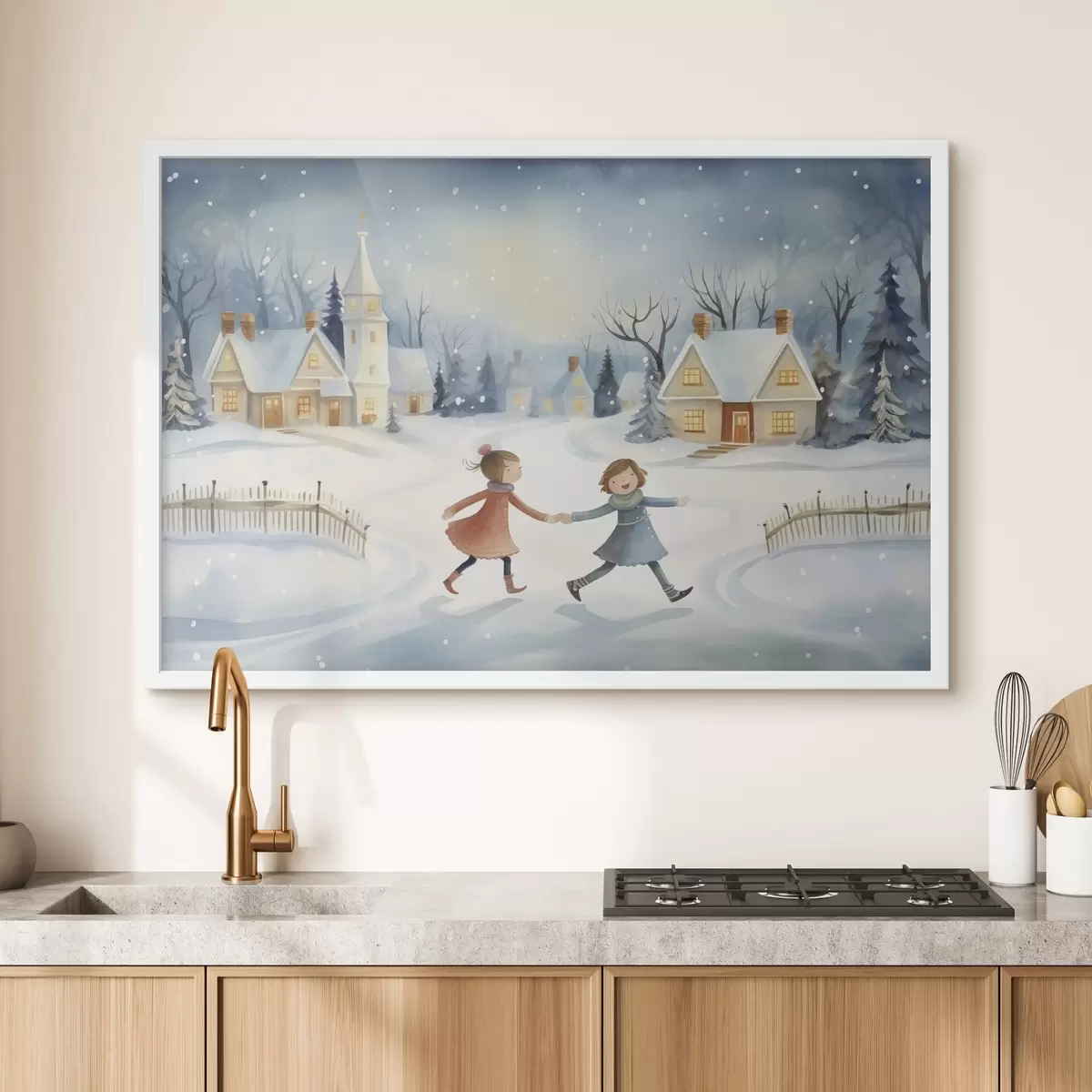 Poster Mädchen im Winterdorf, Schneeflocken, Aquarell, Häuser, Wald Nr f41385