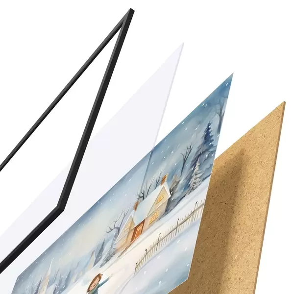 Das Poster besteht aus einem Rahmen, Plexiglas, einem gedruckten Bild und einer Rückwand aus Spanplatten. Dank der Halterungen auf der Rückseite kann das Poster sofort an die Wand gehängt werden.