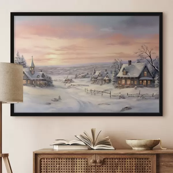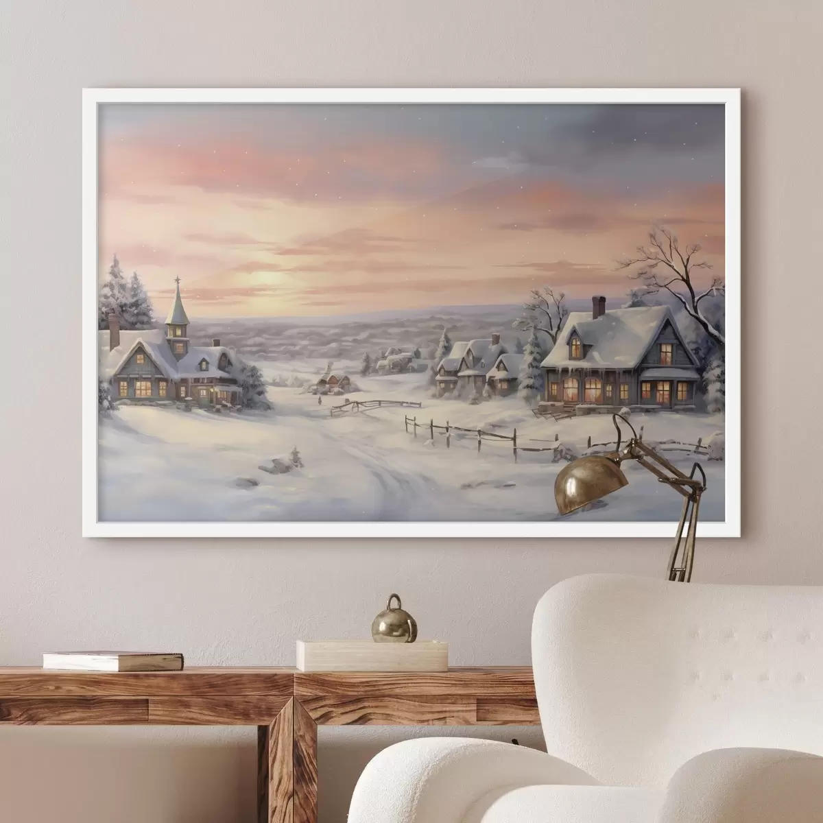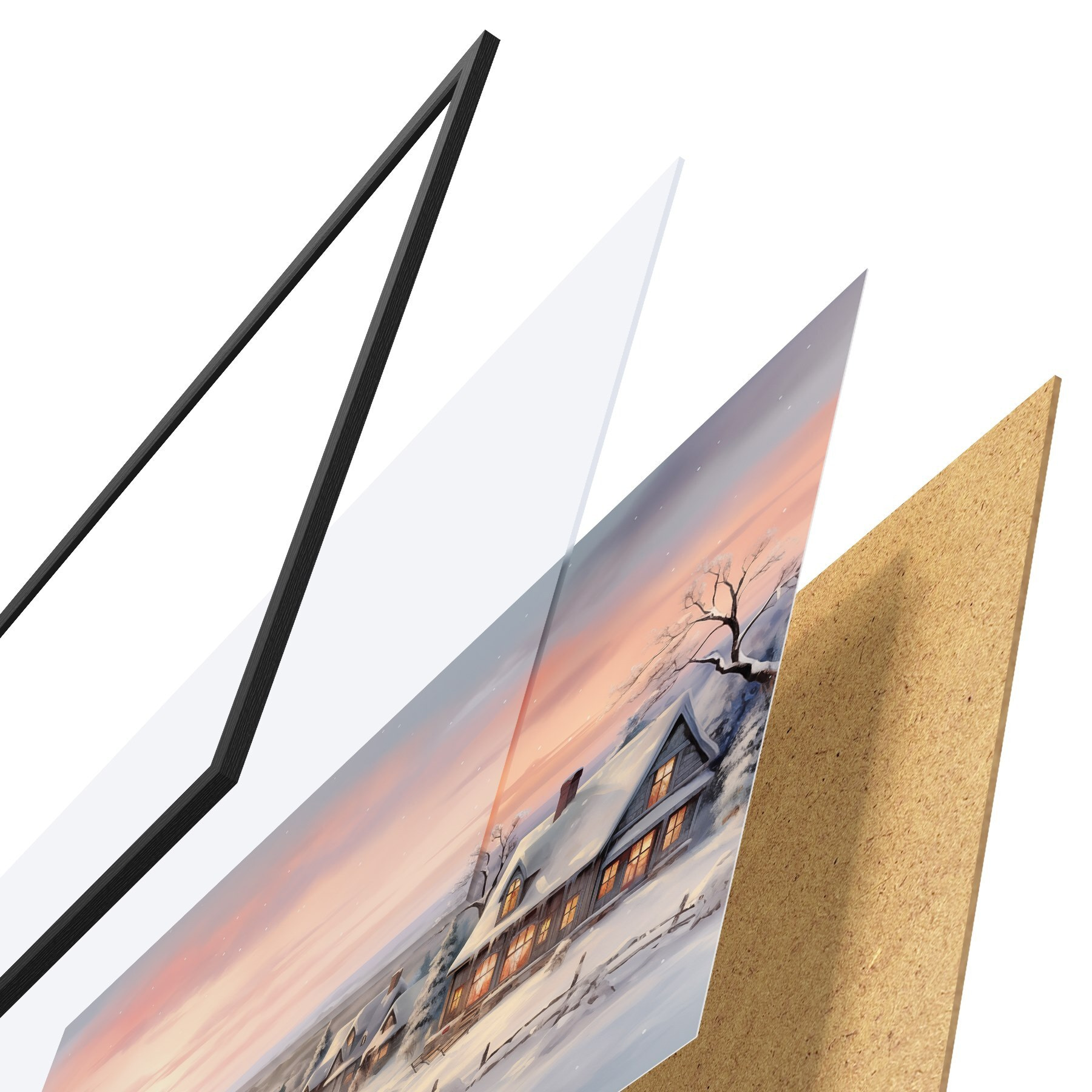 Poster Sonnenuntergang im Winterdorf, rustikal, Aquarell, Schneeflocken Nr f41386