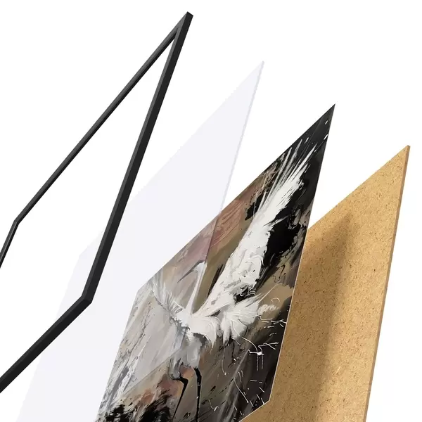 Das Poster besteht aus einem Rahmen, Plexiglas, einem gedruckten Bild und einer Rückwand aus Spanplatten. Dank der Halterungen auf der Rückseite kann das Poster sofort an die Wand gehängt werden.